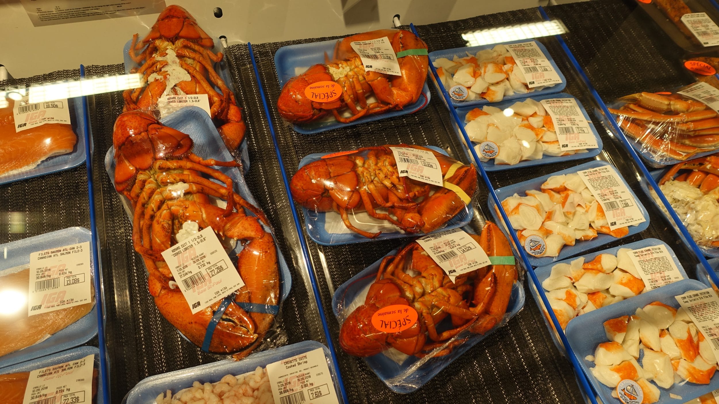 Aproveitamos o carro para ir às compras (gosto muito dos supermercados IGA, eles têm prateleiras muito mais variadas e bem abastecidas do que os outros). Como eu estava a dizer, é época da lagosta no Canadá. Os preços ainda são altos no início da temporada (18$CAD por lagosta), um leitor nos disse que tivemos que sair por 9$CAD por libra e optar por uma lagosta entre 1 lb- 1 1/4 lb, é a melhor relação qualidade/preço. Mas, francamente, já não é nada caro em comparação com a França. Ohlala!