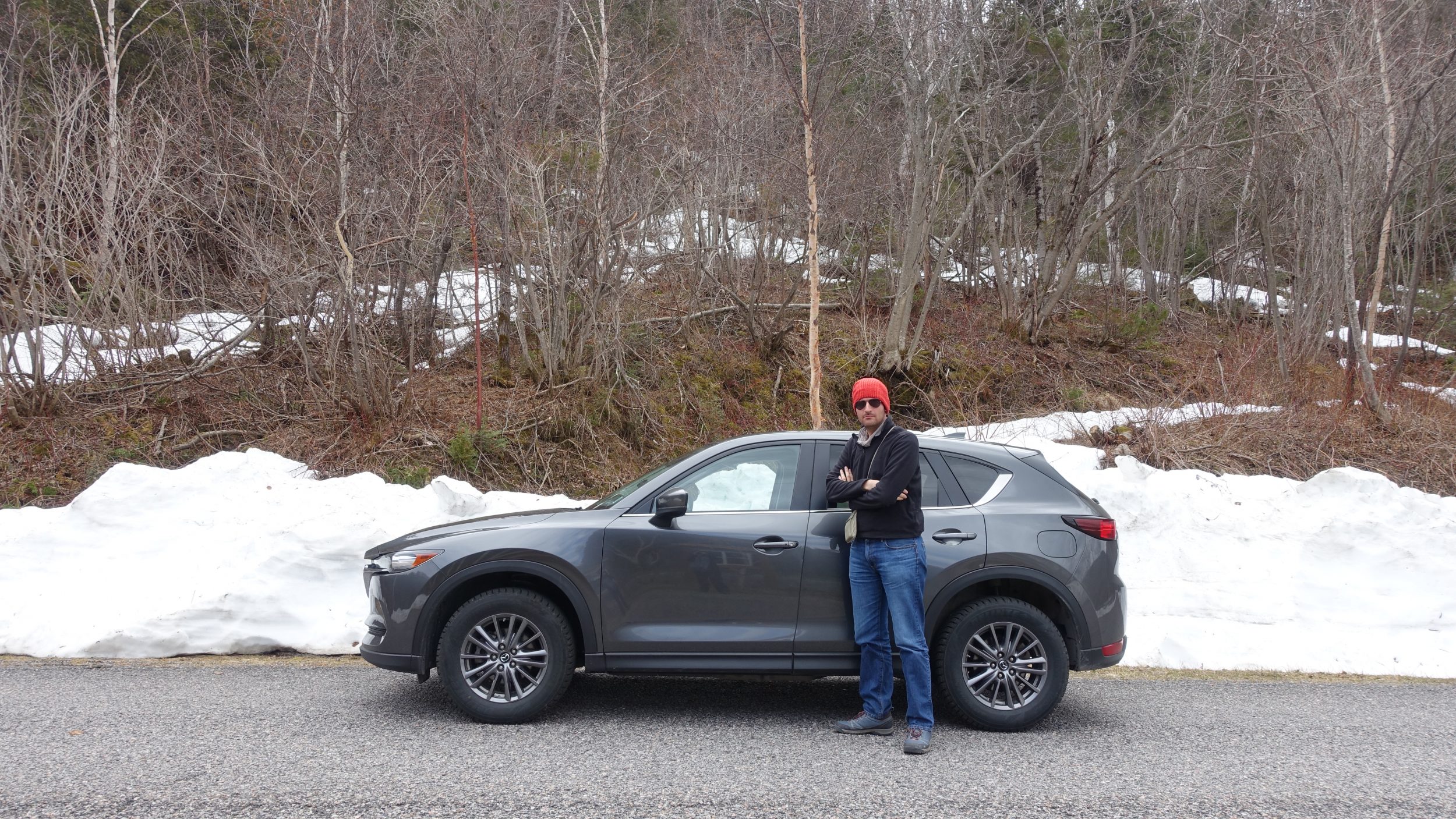 Nós tínhamos reservado um carro compacto, mas eles não podem ter muitos deles, então fomos modernizados, dando-nos um pequeno 4×4. Você tem que saber que os carros aqui tendem a ser enormes, para suportar tempestades de neve, etc. Por isso até o “pequeno” 4×4 nos parece bastante grande e largo. Mas nós gostamos muito porque é o estado da arte, com um sinal luminoso no espelho retrovisor assim que um carro está no ponto cego. Há até um alerta sonoro se você acender a luz indicadora enquanto um carro está ao seu lado. A câmara de visão traseira para estacionamento é super útil – porque você nem sempre se sente confortável com um carro grande como esse. Em maio, não podemos mais usar rodas de inverno, mas como nos foi dito, rodas de verão no Canadá = rodas de inverno na França 🙂 Foi-nos dito para ter cuidado na estrada também porque no final do inverno, há muitos buracos.