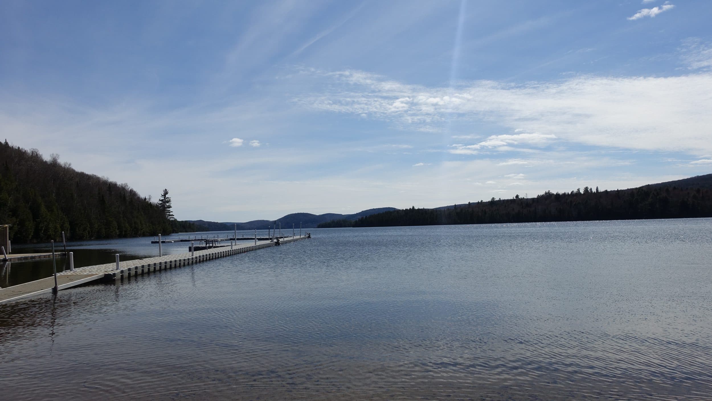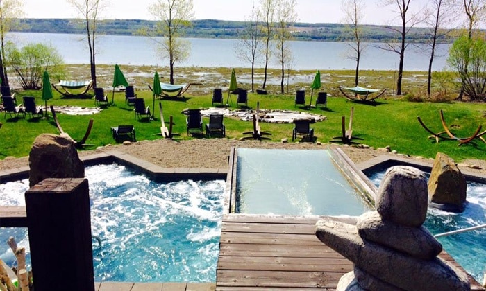Da cidade de Quebec, a estrada se torna mais suportável, há mais árvores, estamos, às vezes, rodeados de florestas de pinheiros. Paramos no Spa des Neiges, que está literalmente coberto de neve no inverno, é muito bonito. Mas em Maio, também é muito bonito. Há diferentes piscinas, a água está entre 20° e 41°C. Há 2 saunas, um hammam, salas de descanso (onde você pode pedir para acender a lareira). Pagamos 45$/pessoa (incluindo toalhas, e acesso às piscinas). Você tem que vir com chinelos (é obrigatório), e pode alugar um roupão de banho (6$). Existem vários spas como este na cidade de Quebec e Montreal, mas este é um dos únicos que realmente utilizam água termal. Claro que não é de modo algum comparável com todas as banheiras quentes que testamos no Japão ou na Islândia, mas ainda é muito limpa e agradável, especialmente depois de um dia de condução difícil.