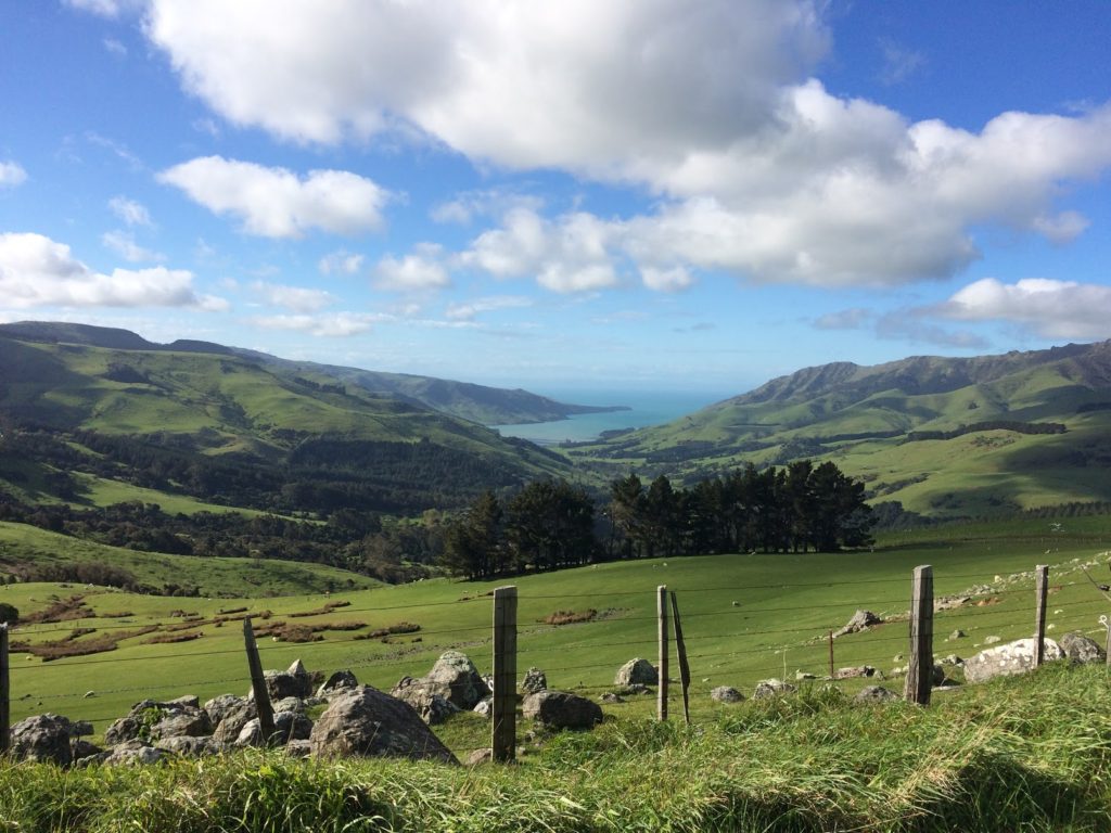 O caminho de Christchurch para Akaroa não é, no início, nada fora do comum. Estamos felizes por encontrar uma fazenda vendendo ovos (entre NZ$5 e NZ$6 a dúzia) e mel de manuka. É muito fácil de identificar este tipo de fazendas, elas colocam placas na beira da estrada com a lista de produtos vendidos. Para os ovos, as pessoas geralmente vêm com suas caixas de papelão, mas para turistas como nós, eles dão caixas grátis. Quando está marcado “ao ar livre”, significa que as galinhas têm acesso ao exterior