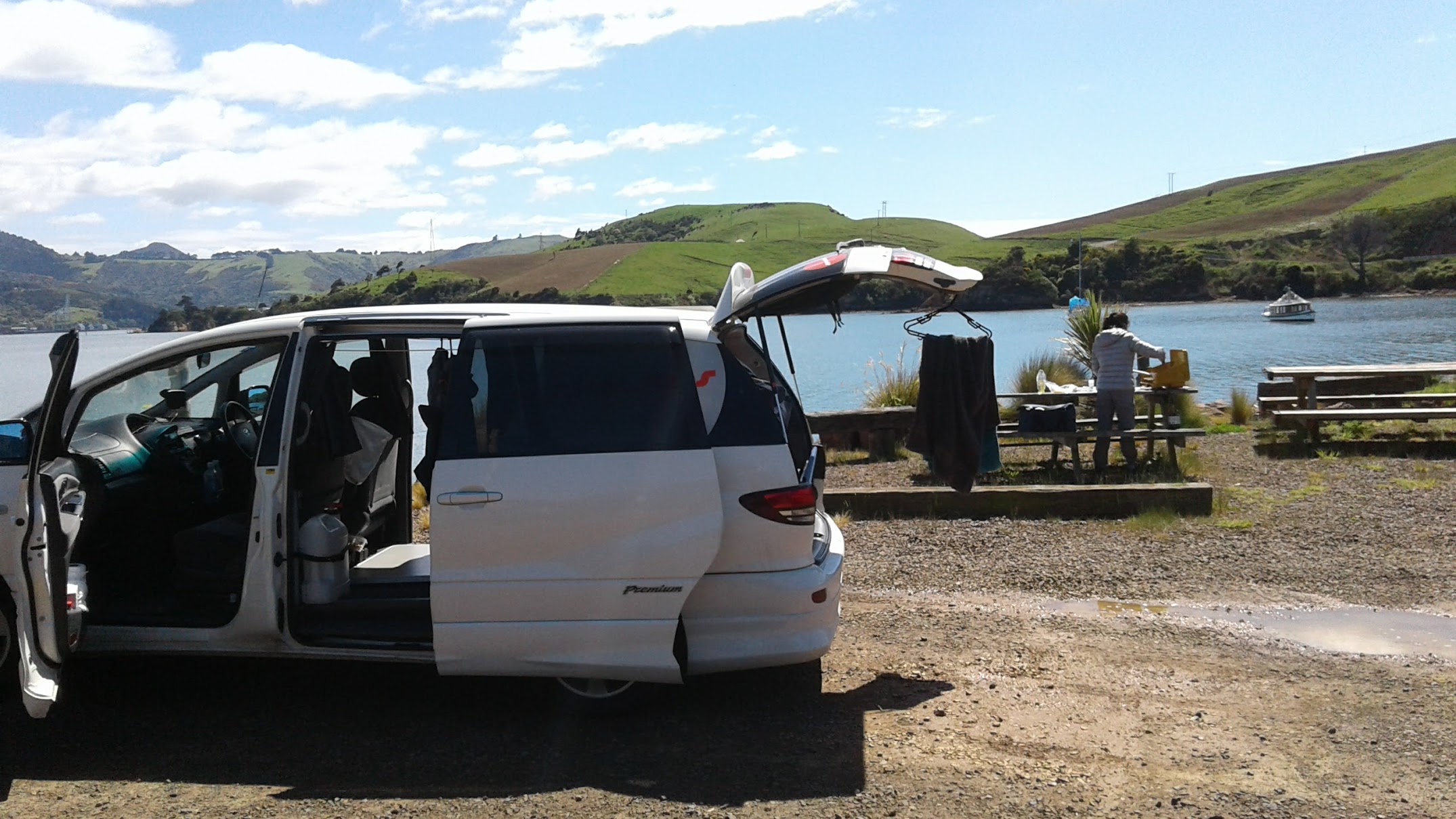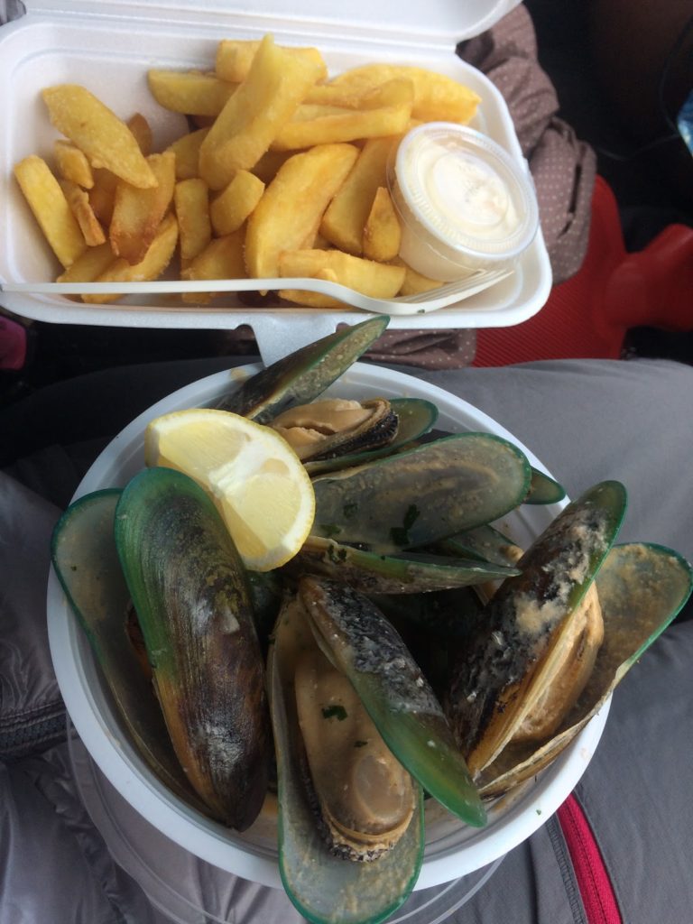 Não é muito sério, no caminho, um caminhão de alimentos nos faz um olho e eu valido a 100% os mexilhões verdes (gigantescos) que a vendedora me entrega (12$NZ). As gaivotas parecem ser da mesma opinião porque dão a volta ao nosso carro às dez.