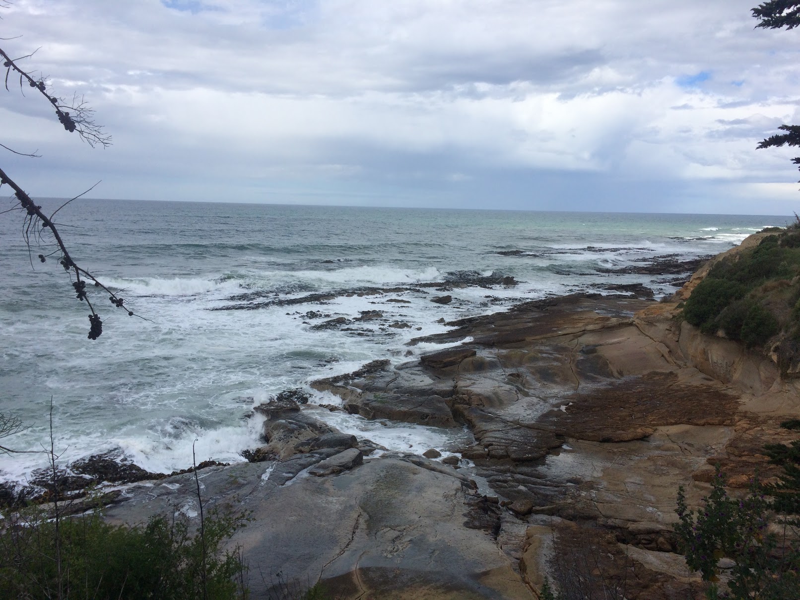 Vamos até Slope Point para ver bolas que parecem pedras Moeraki, mas em uma versão rachada ou aberta no topo, criando piscinas naturais. Infelizmente, estas bolas só são visíveis na maré vazia e nós perdemos completamente.