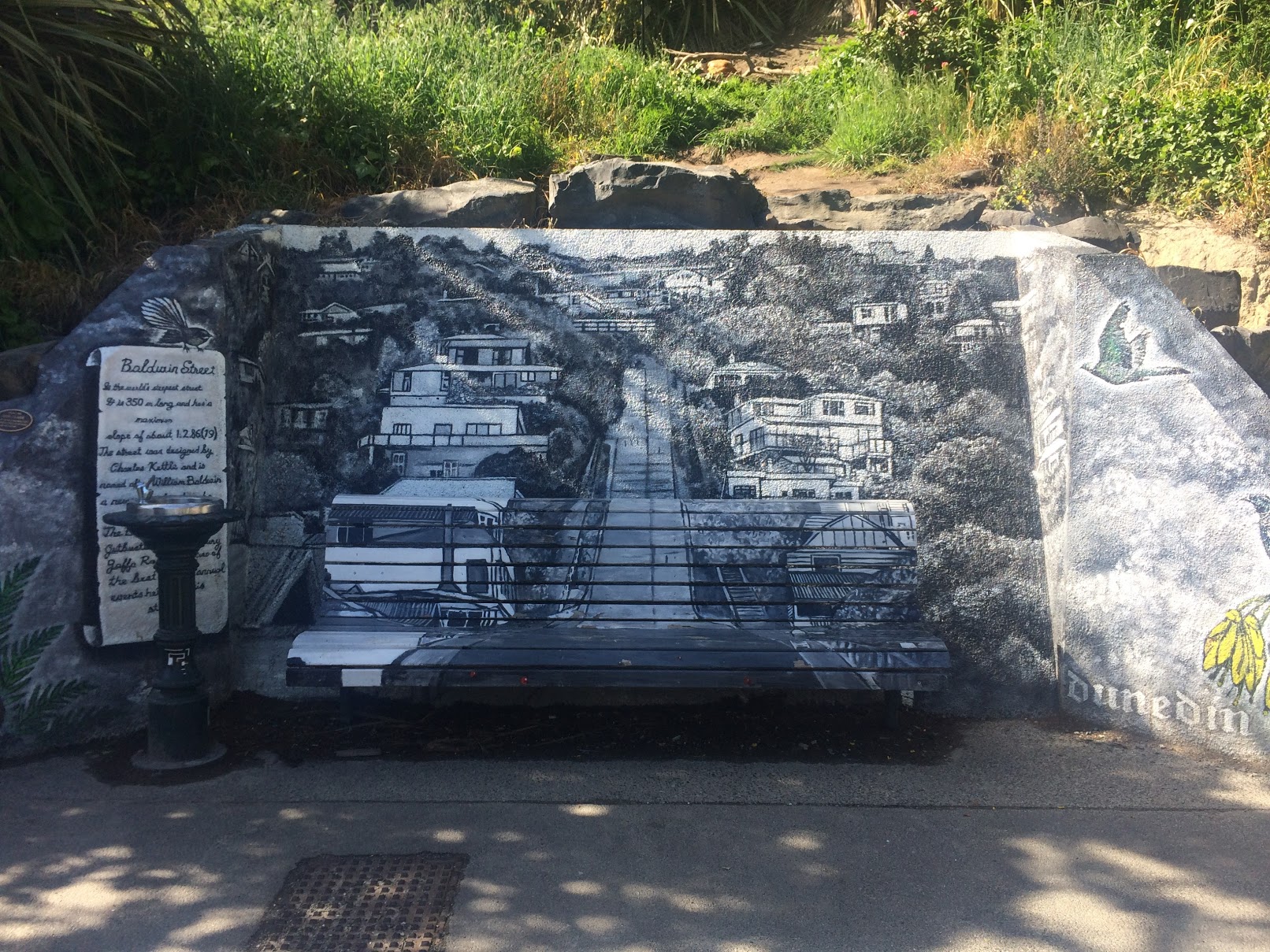 Nossos esforços são recompensados com um banco com graffiti bonito e uma torneira distribuindo água potável fresca. Agora tudo o que temos de fazer é descer alguns pequenos degraus até ao fundo.