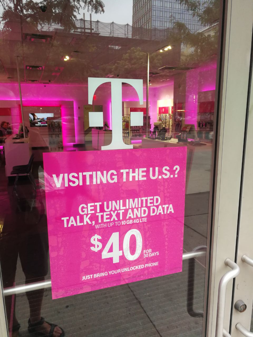 Enquanto passeávamos por Nova Iorque, passamos por várias lojas de telemóveis T-Mobile que apresentam uma oferta para turistas. Por $40 (+ impostos), você tem direito a 10 GB de dados ilimitados, telefone e SMS nos Estados Unidos por 30 dias.
