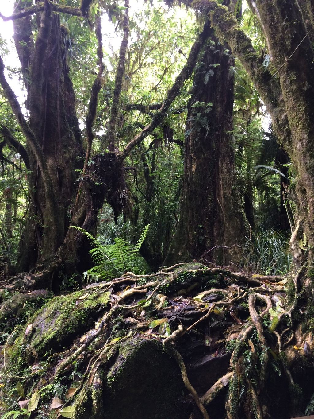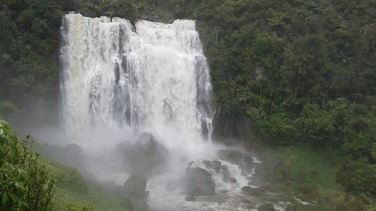 Fazemos um pequeno desvio para ver Marokopa Falls, visível da plataforma a 50m, mas a cascata é tão alta que a água chega até nós e nos chicoteia na cara