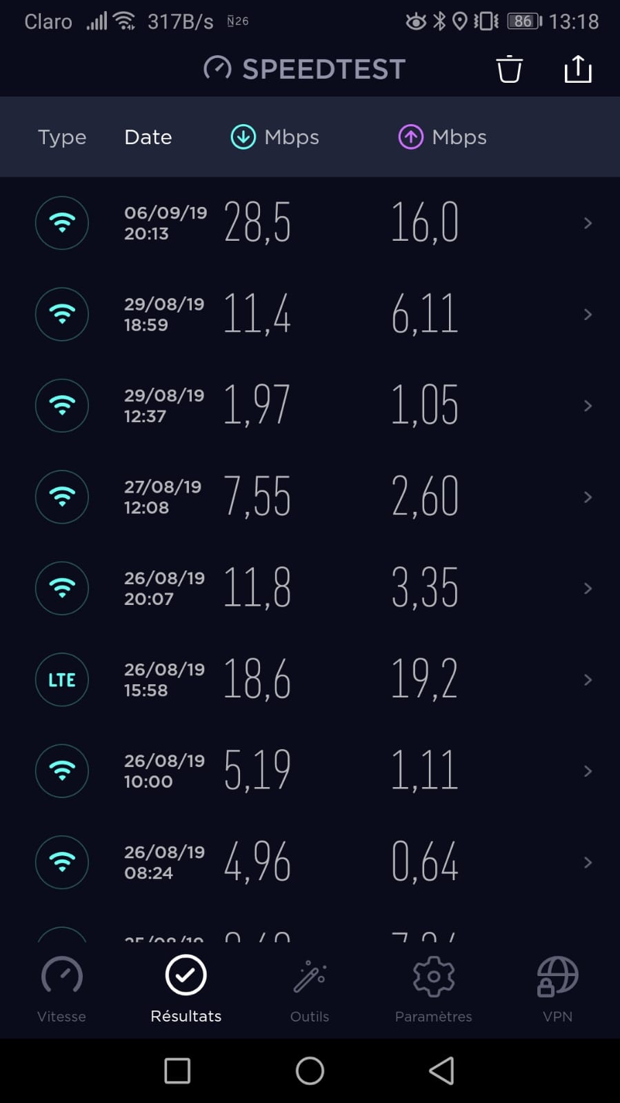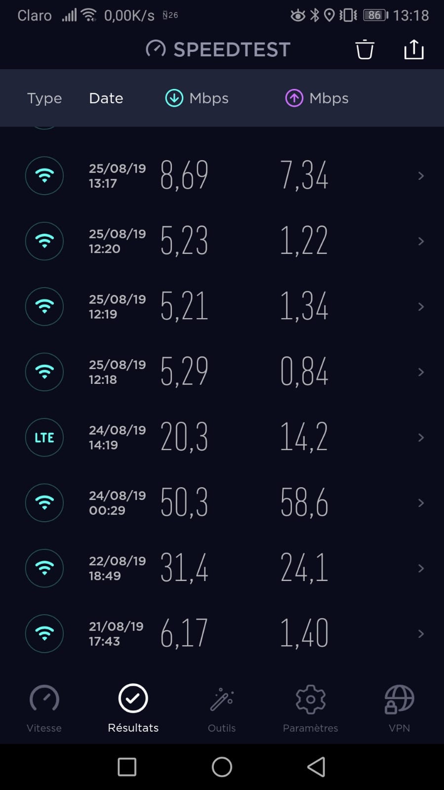 Aqui estão os diferentes testes de velocidade feitos em Medellín. O logotipo identifica WIFI e LTE = 4G. Como podem ver, varia muito de um edifício para outro.
