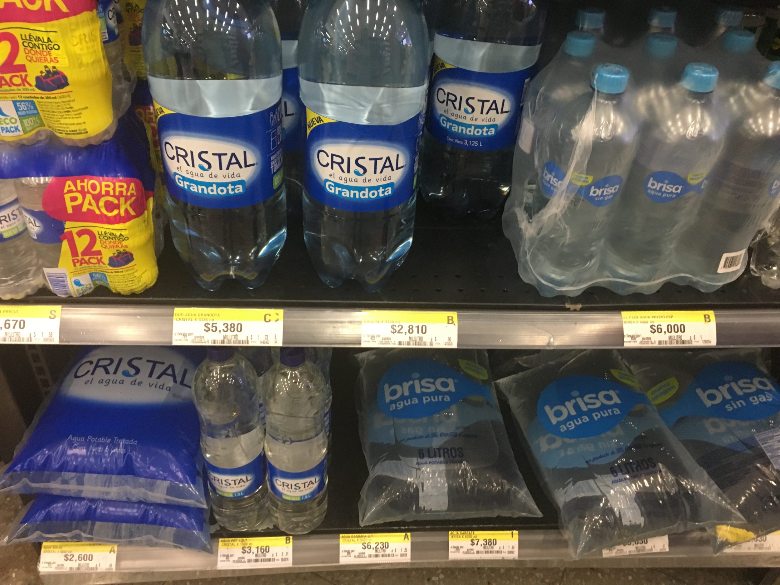 A água da torneira é potável na Colômbia, mas depois de alguns testes, eu a acho um pouco amarela, com um gosto estranho. Nós decidimos comprar água engarrafada e descobrimos com diversão que eles vendem pacotes de água numa espécie de saco plástico de 6 litros (por 2600COP càd 0,7 euros).