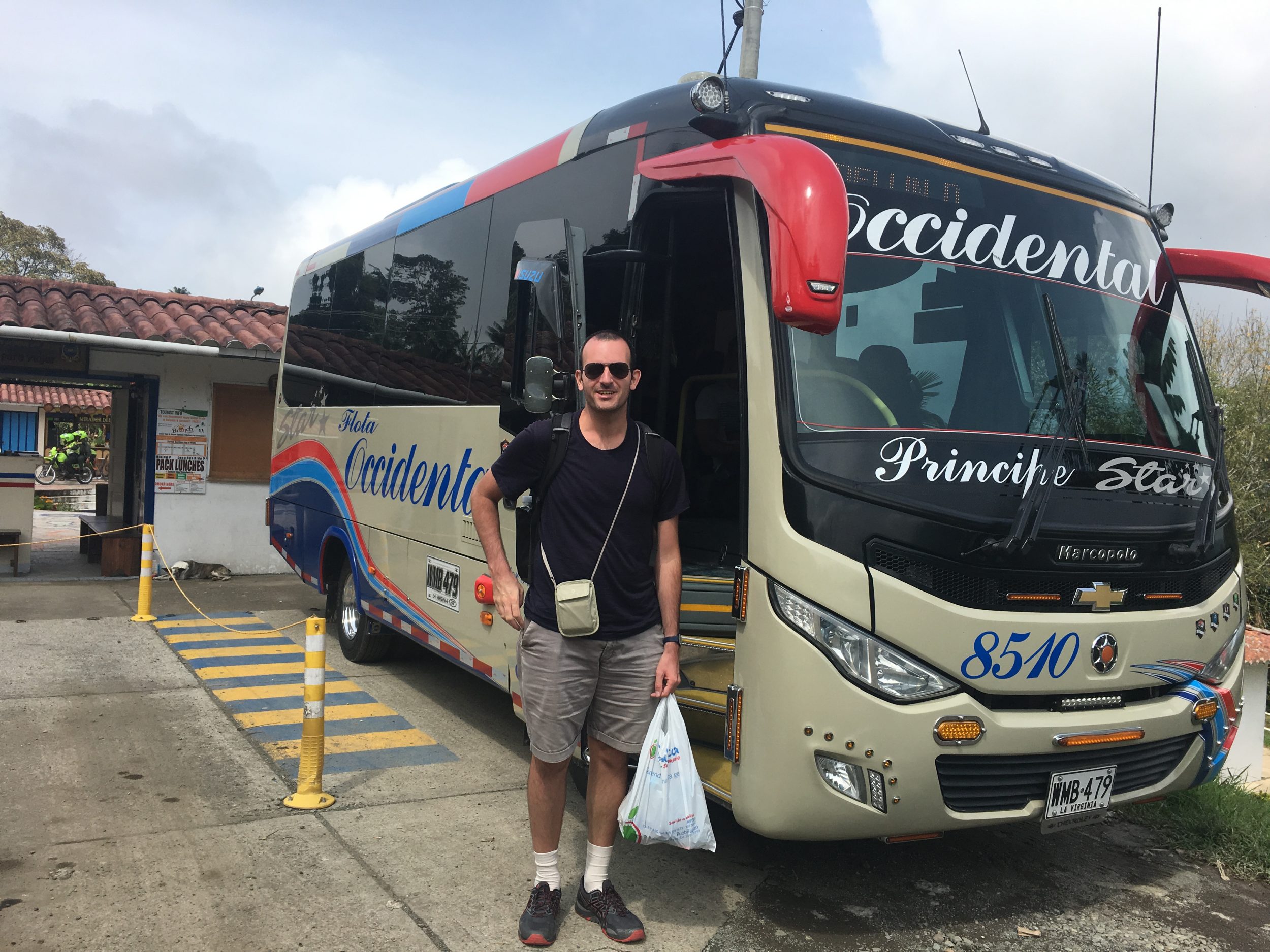 Faz uma paragem de cerca de 15 minutos em Pereira, depois outra paragem no meio do nada para comer. O autocarro está equipado com sanitas, ficha USB e carregador (Wifi muito baixo, por outro lado) e até um ecrã pessoal como nos aviões. Em Medellín, vai parar na estação de metro de Sabaneta (aconselhamos a parar aqui), depois no Terminal del Sur. Duração da viagem: 8 horas devido a obras (em setembro de 2019), 6 horas em horário normal. A viagem é fornecida pela empresa Flota Occidental (os bilhetes podem ser comprados online).