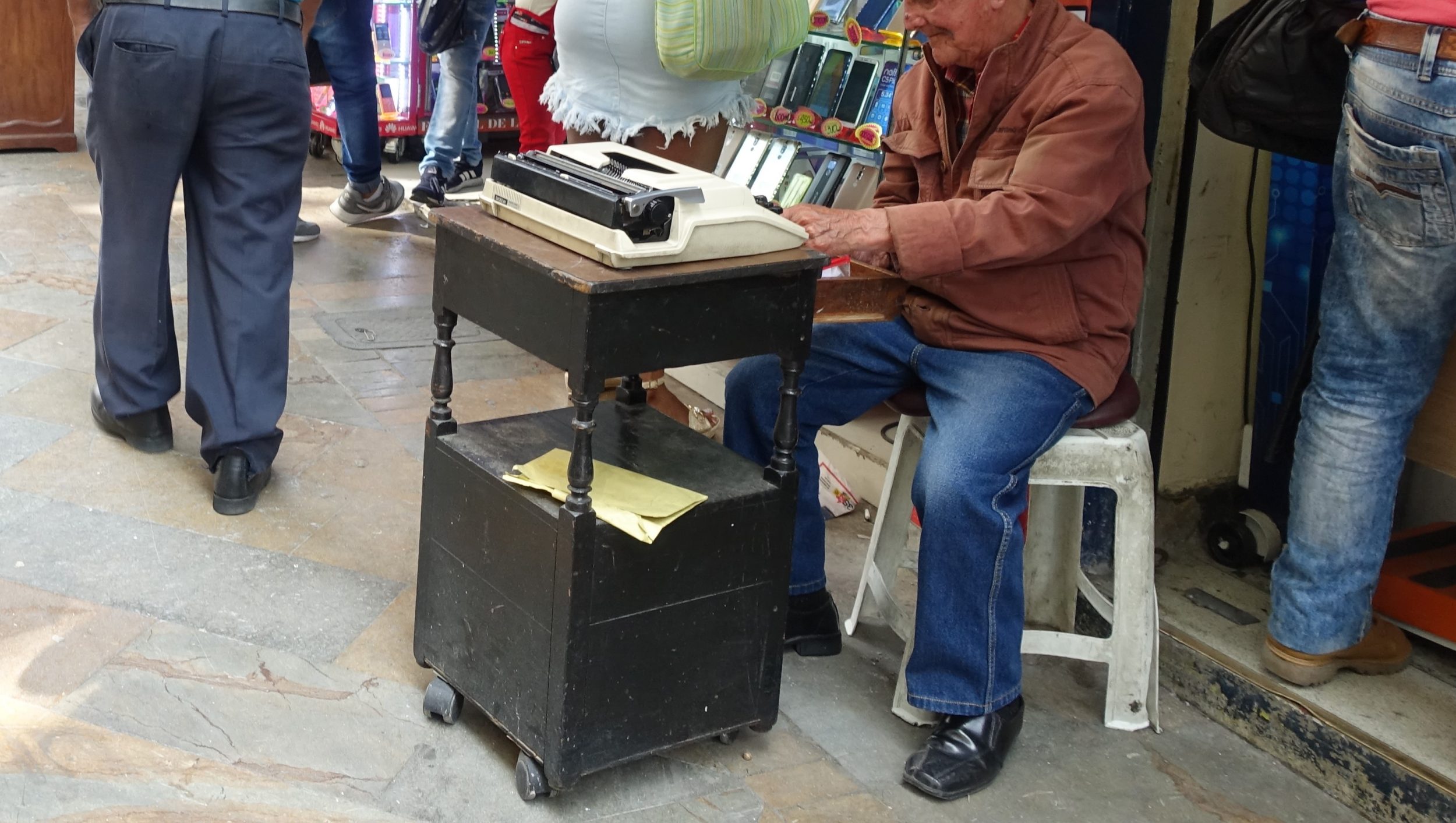 Nas pequenas ruas em ângulo recto, vemos cavalheiros equipados com máquinas de escrever, prestando um serviço muito útil às pessoas analfabetas. Um pouco mais à frente, um sinal indica 100COP/mn de comunicação. Isto é o equivalente a uma cabine telefônica, exceto que é um smartphone acorrentado a uma mesa, e o próprio vendedor monitora o tempo de comunicação.