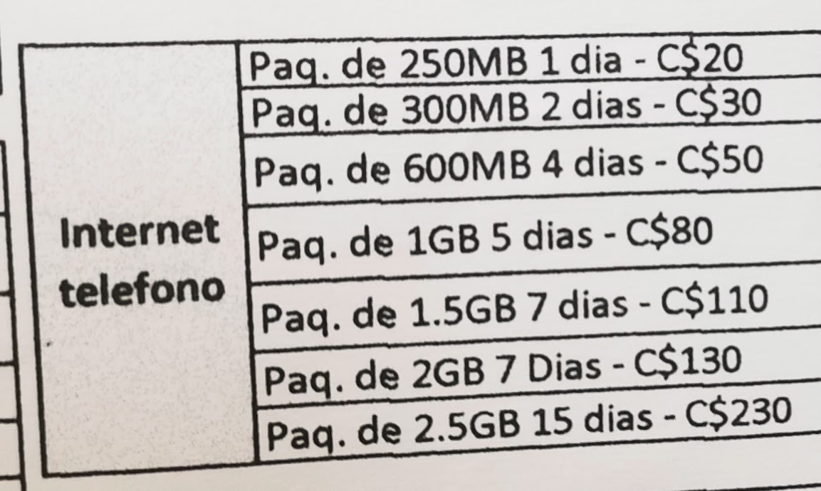 Além do cartão SIM, você deve escolher um “pacote”. Escolhi o pacote C$110 que lhe permite utilizar 3GB de Internet durante 7 dias (+ WhatsApp, Twitter e Facebook ilimitados).