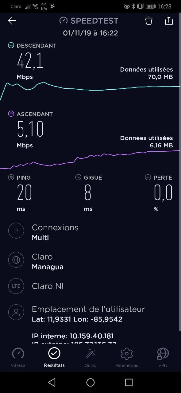 4G na Nicarágua é muito bom. No teste abaixo, realizado em Granada em 1 de novembro de 2019, vejo uma conexão downlink de 42 MB/s downlink e 5 MB/s uplink. Isto é mais do que suficiente para videoconferência