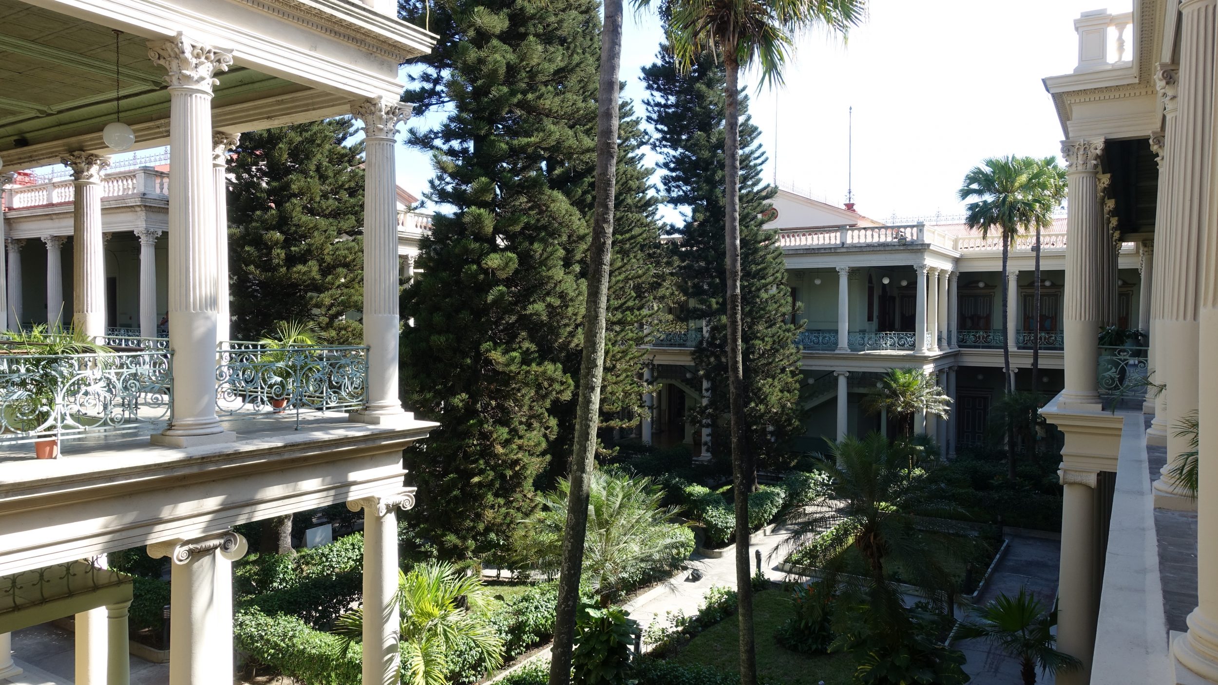 Mesmo ao lado está o antigo Palácio Nacional. A entrada é paga (3$, apenas em dinheiro), um guia que fala inglês mostra-nos o interior vazio do palácio. A parte mais interessante continua sendo seu jardim com 5 grandes pinheiros representando os 5 países da América Central (naquela época o Panamá ainda pertencia à Colômbia e o México não é realmente considerado como parte da América Central). Há o Teatro Nacional aqui ao lado, com arquitetura francesa, mas não tivemos tempo de ir lá.