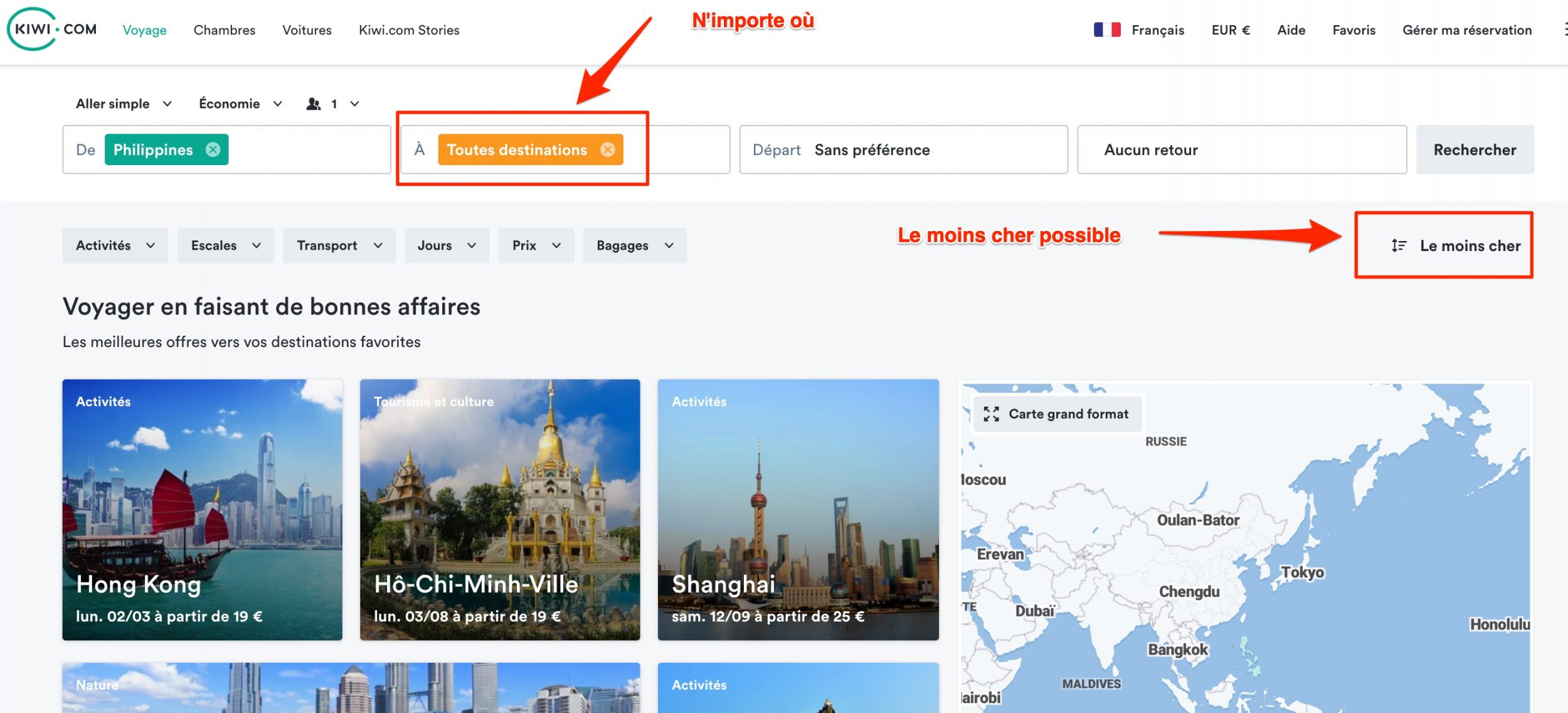 Digamos que eu quero ir para as Filipinas, preciso de um bilhete de saída. Eu primeiro faço uma pequena pesquisa sobre Kiwi que é muito útil para determinar o destino mais barato das Filipinas. Você será reembolsado após o cancelamento, mas você pode avançar o menos possível.