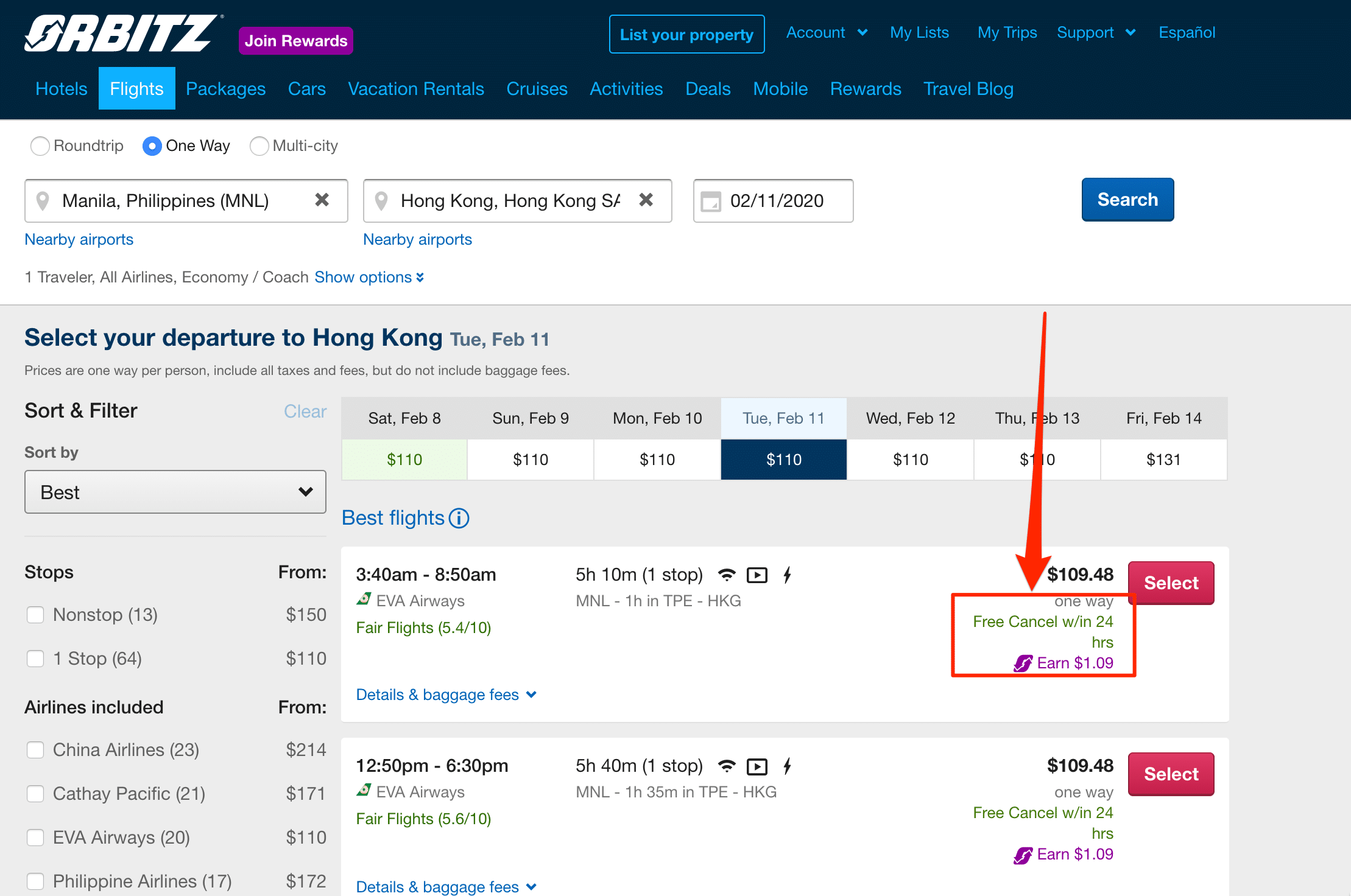 Depois procuro o voo para Orbitz, certificando-me de que a menção “Cancelamento gratuito” está presente.