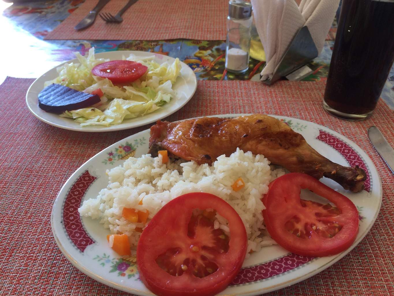 Diante de tanta riqueza e abundância, decidimos economizar nossos centavos em um restaurante local, onde o almoço custa apenas 4400$CH por dois (6 euros), e não 4000$CH por prato. Enquanto olhamos para o menu, todo mundo está ocupado nos mostrando os pratos rs: isto é um pollo asado, isto é uma ensalada, pollo frito isto é ahahahah É despretensioso, é bom, é local