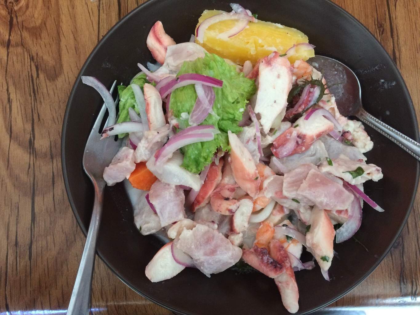 A minha barriga precisa de ceviche. Esta é a oportunidade de testar o mixto ceviche peruano, que eu gosto muito! O Peru é promissor! JB só vai se contentar com frutas, em preparação para o enorme churrasco que nos espera esta noite no albergue