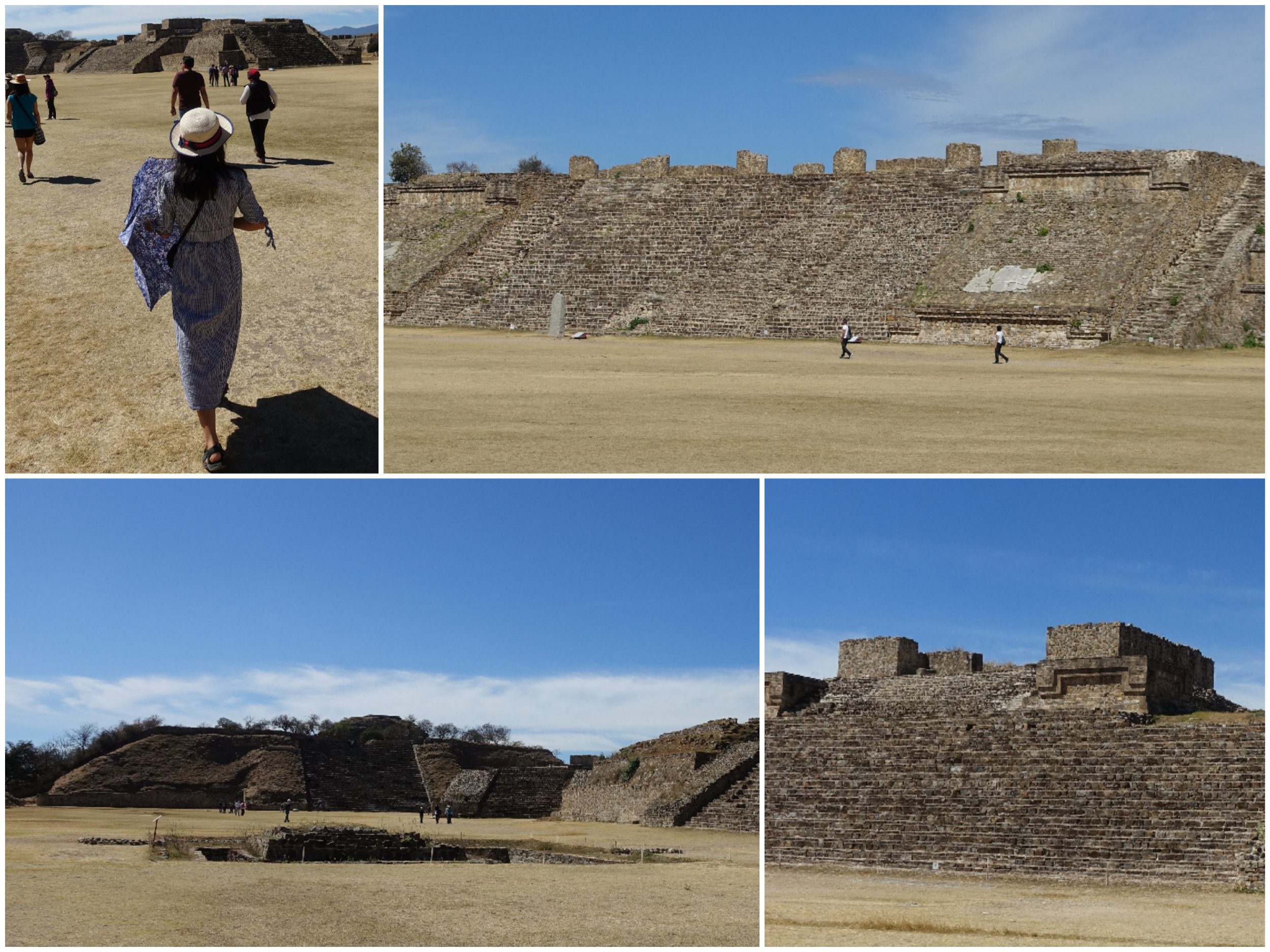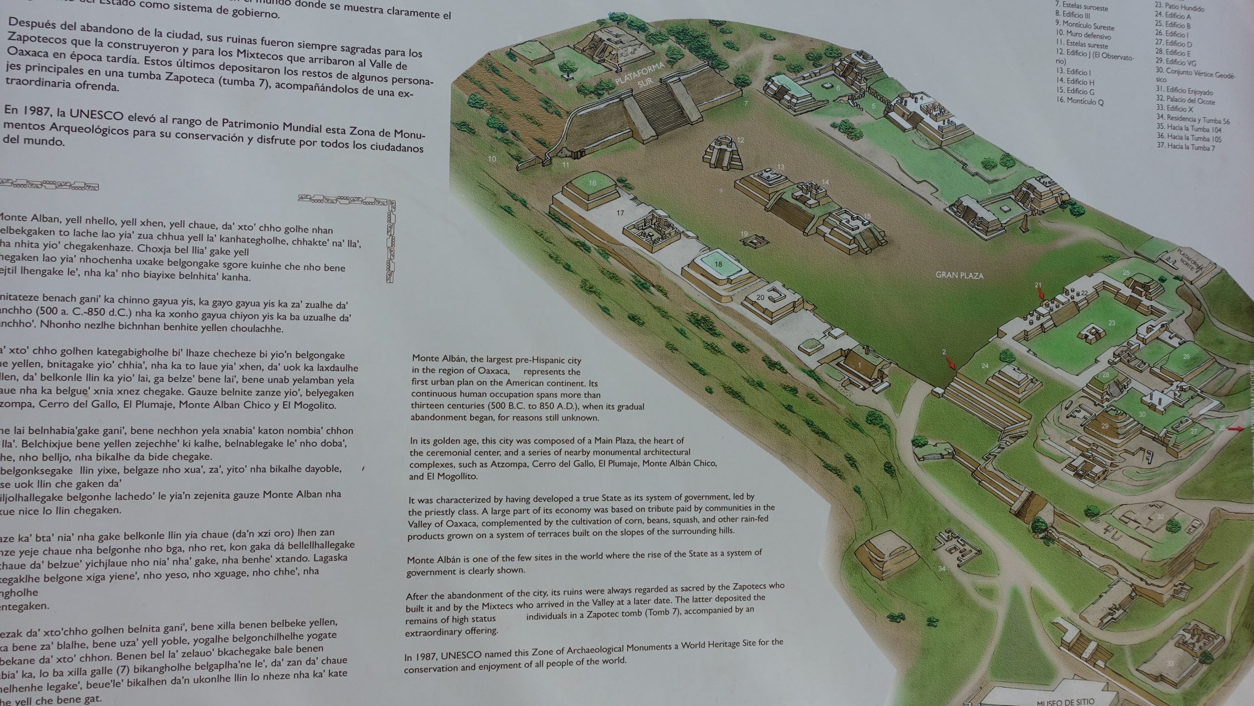 O nosso guia é o Zopatheque. Ele é bilingue e muda sem esforço do espanhol para o inglês. As suas explicações são bastante interessantes, o que me faz esquecer os inconvenientes pré-turno. Ele nos acompanha por 40 minutos (80MXN/entrada/pessoa, não incluído no preço do passeio) e nos deixa 1 hora no local para explorarmos sozinhos. Geograficamente, a região de Oaxaca está realmente no meio do México, e Monte Alban está no centro desta região, no meio do Oceano Pacífico e do Golfo do México. Não admira que estivesse tão povoado no tempo dos Zopathecs. As estruturas parecem simples mas por baixo existem redes de distribuição de água complexas e algumas ruínas são colocadas de modo a que estejam alinhadas com o sol numa determinada data.