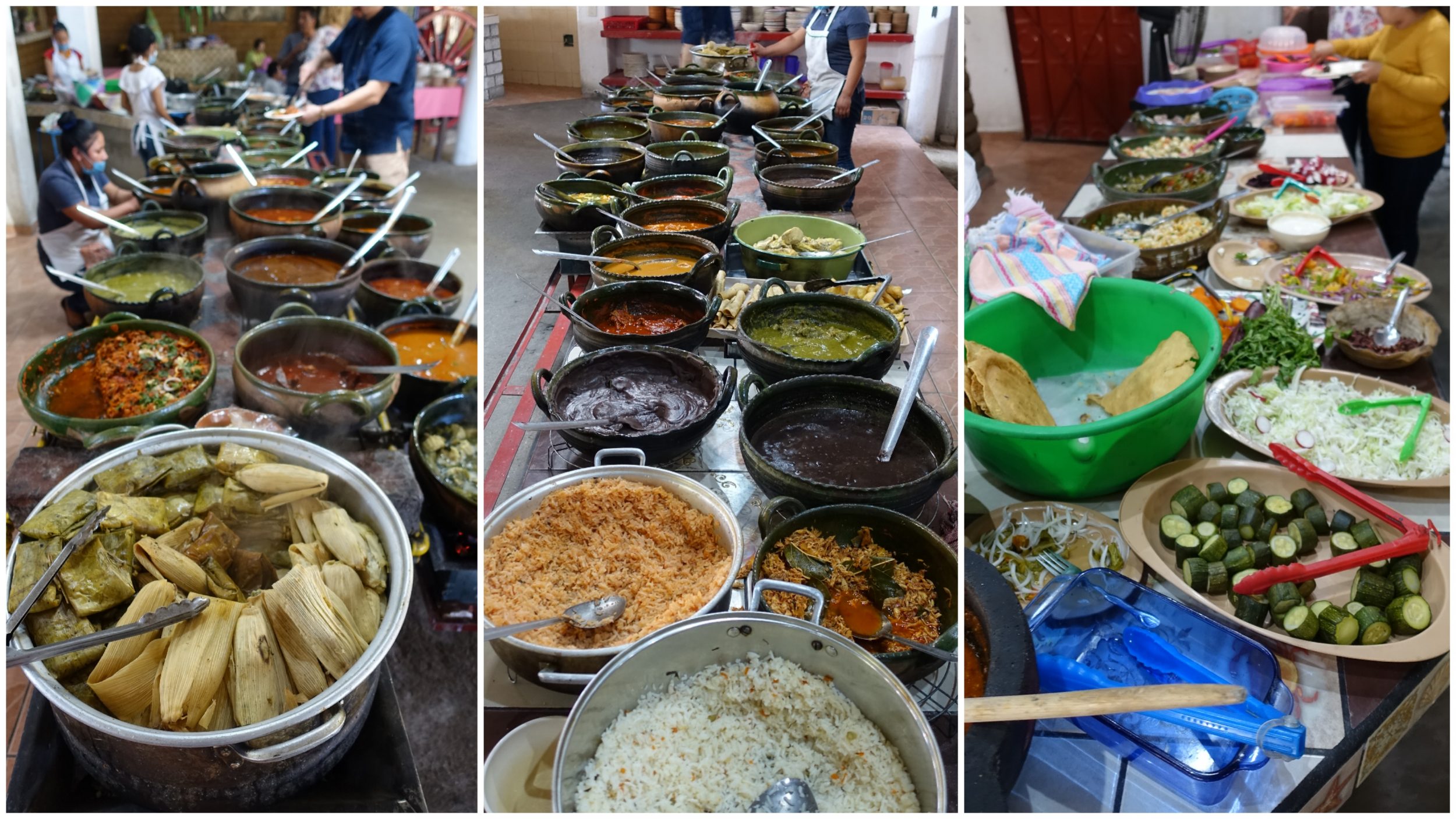 O que você tem absolutamente que provar quando vem para Oaxaca é o tamale, uma espécie de massa recheada que é cozida a vapor – lembra-me o “banh gio” vietnamita, não tão bom, é claro. E as 6 toupeiras (com cores diferentes). Estes são molhos feitos com ???? (sem lembrar os nomes dos ingredientes) que realçam o sabor do arroz e da carne. A qualidade das toupeiras depende muito da pessoa que as prepara. Neste caso: neste restaurante, é muito mediano, mas encontramos um bom vendedor de mole negro em Oaxaca. Custo do buffet: 150MXN + bebida (15 a 20MXN) + gorjeta