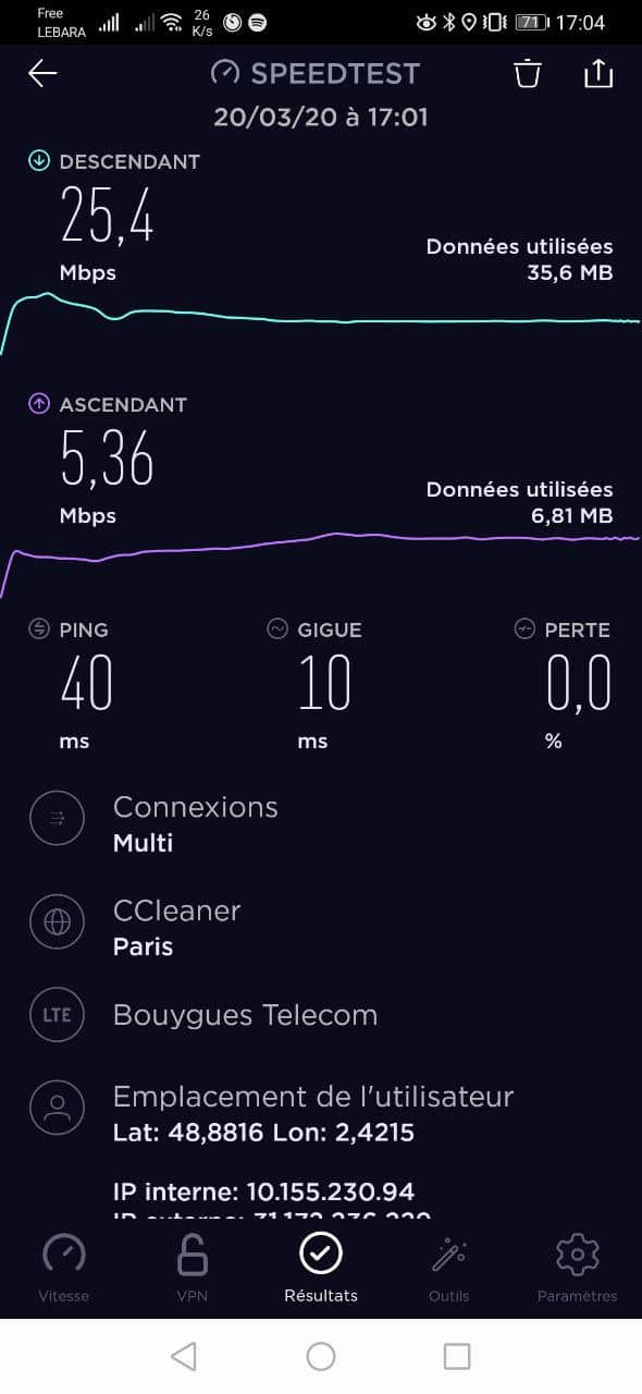 Durante este teste de velocidade realizado em Paris em março de 2020, estou conectado em 4G+, medo uma downlink de 25 mb/s e 5 mb/s ao subir. Já vi muito melhor, mas é mais do que suficiente para as minhas necessidades.
