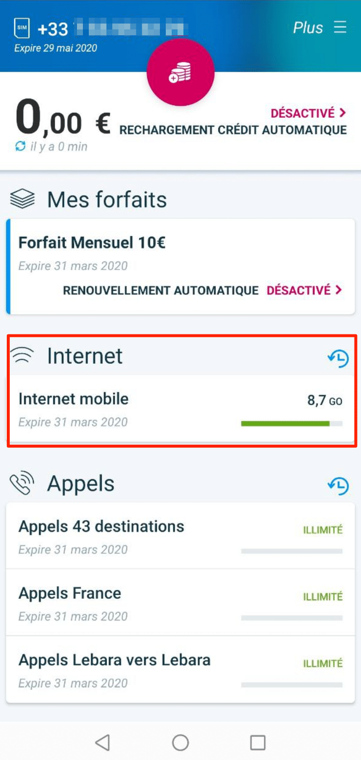 • A taxa fixa mensal a 10 euros: 10 GB de dados + chamadas ilimitadas para a França e 43 países + SMS ilimitadas. Este pacote é renovado a cada 30 dias, mas a renovação automática pode ser desativada muito facilmente através da aplicação. Válido por 30 dias.
