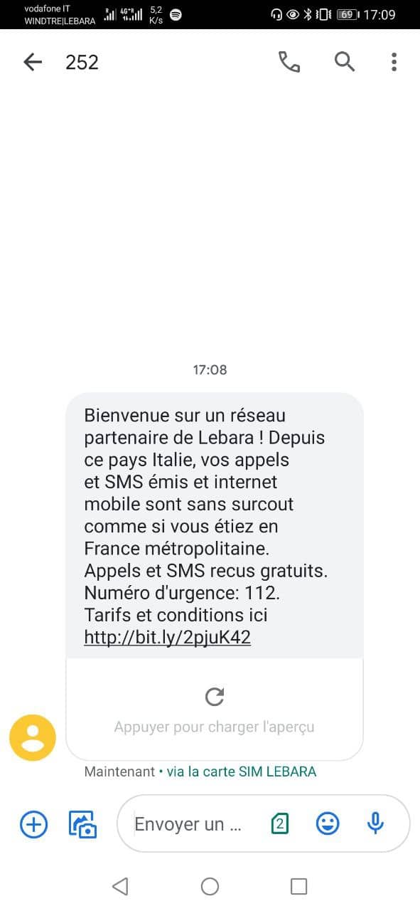 Quando você chega a um novo país, recebe um SMS que o avisa como neste exemplo quando eu chego na Itália.