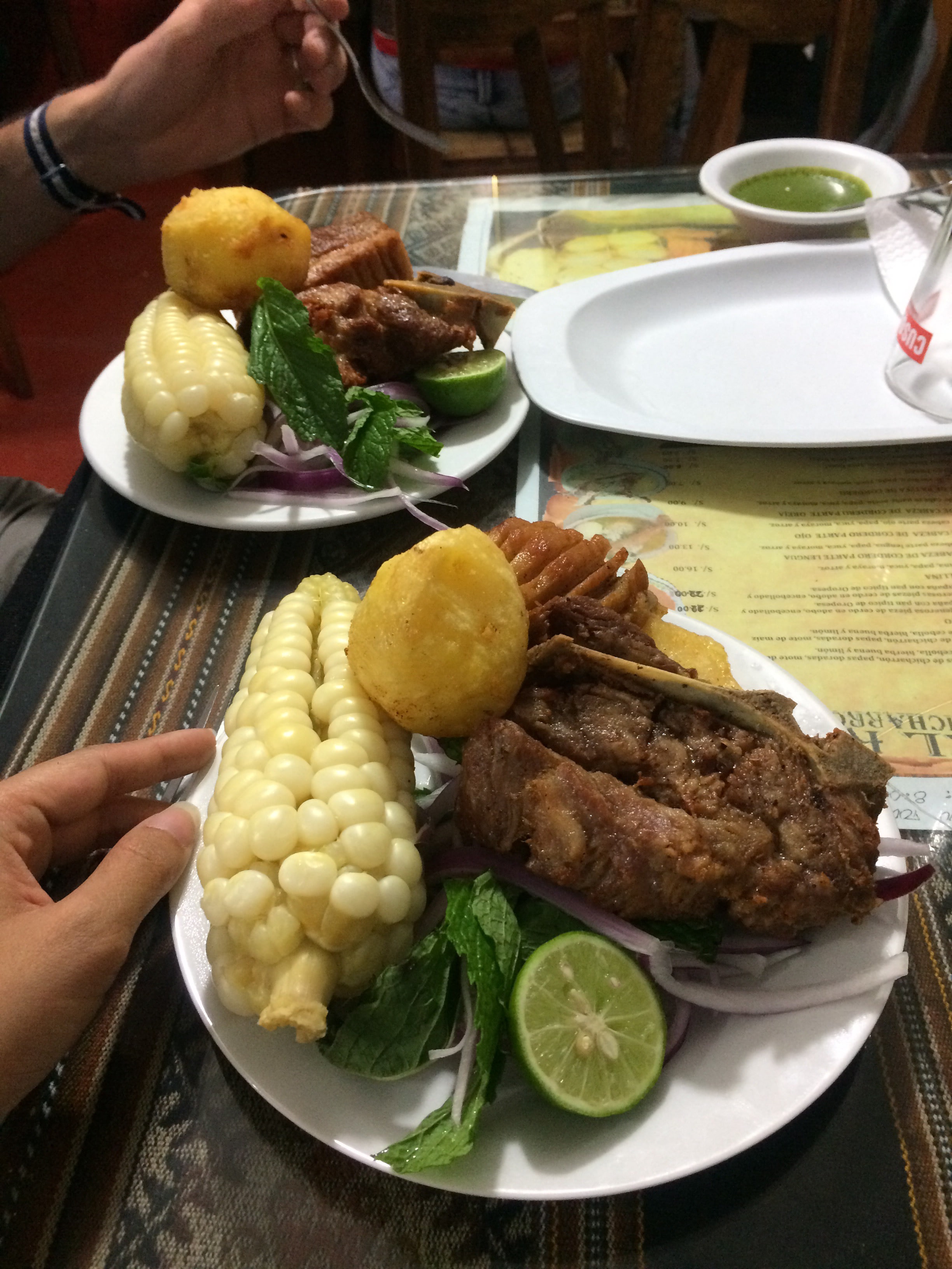 Como os restaurantes desta praça estão fora de preço, vamos para a rua Pampa del Castillo, onde você pode encontrar chicharrón (porco frito) para 16 soles/pessoa. Só há peruanos no restaurante. A pele do porco é trabalhada de uma forma especial para dar uma textura muito agradável, mesmo que esteja cheia de gordura