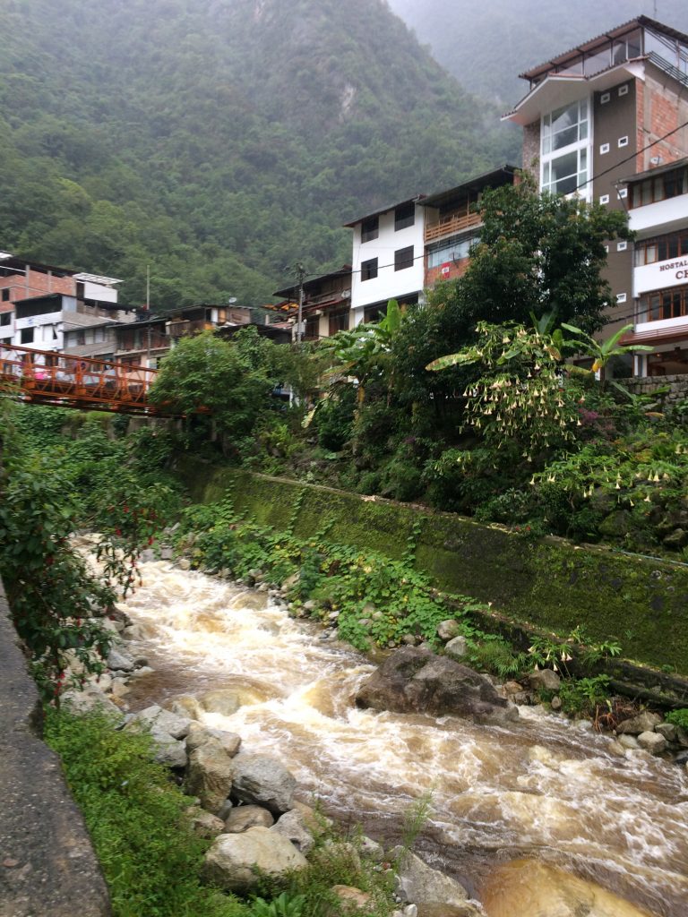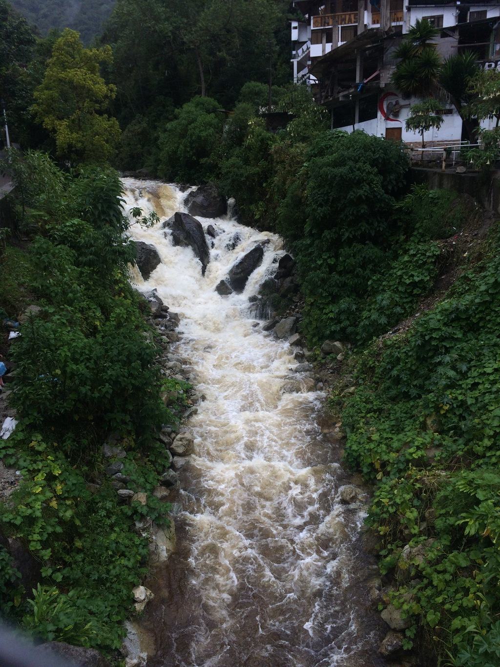 Está a chover a cântaros, o rio que atravessa Águas Calientes parece estar muito zangado..
