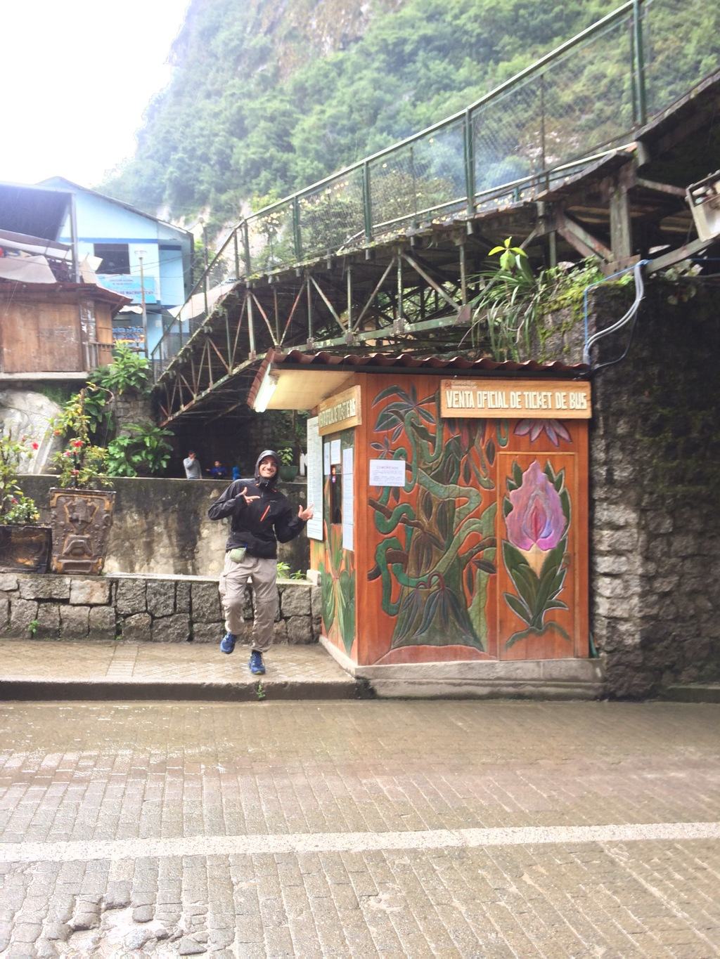 Compramos os nossos bilhetes de autocarro para Machu Picchu (apenas a viagem de ida porque não temos a certeza se queremos voltar de autocarro), 40 soles/pessoa (ou 12 dólares). Como em todo o lado, sempre que compramos um bilhete turístico, temos de tirar o nosso passaporte. Vemos pessoas saindo do ônibus (de volta de Machu Picchu) e estamos morrendo de vontade de fazer-lhes a pergunta “Então? Como foi?” mas quando os vemos com seus ponchos de chuva e seus rostos cansados, dizemos a nós mesmos que talvez não seja o momento certo nem a pergunta certa.