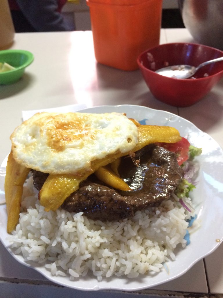 Temos 45 minutos para comer e avisar o restaurante. Finalmente, o cozinheiro vai levar 30 minutos para cozinhar e nós só temos 15 minutos para comer. Ele faz-nos um preço na refeição (20 soles para tudo!! demasiado bom!) e pede desculpa pelo atraso. Hoje, a mulher dele está doente e não pode cozinhar com ele. Sabendo disto, deixamos-lhe uma pequena dica, apesar de a refeição ter sido super decepcionante.