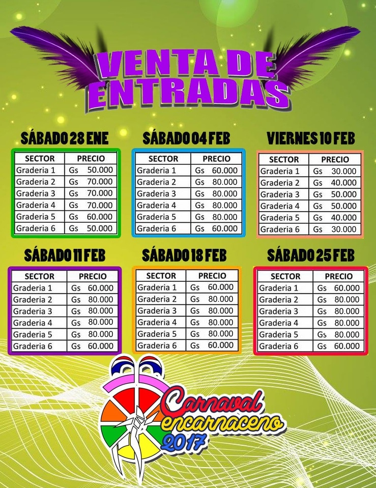 Nos escritórios de vendas: entre 60.000 e 90.000 Gs, dependendo da arquibancada escolhida. Uns dias antes do carnaval, Ticketea vende-me os bilhetes do 3º escalão a 90 000 G por pessoa em vez dos 80 000 G anunciados no site oficial do organizador