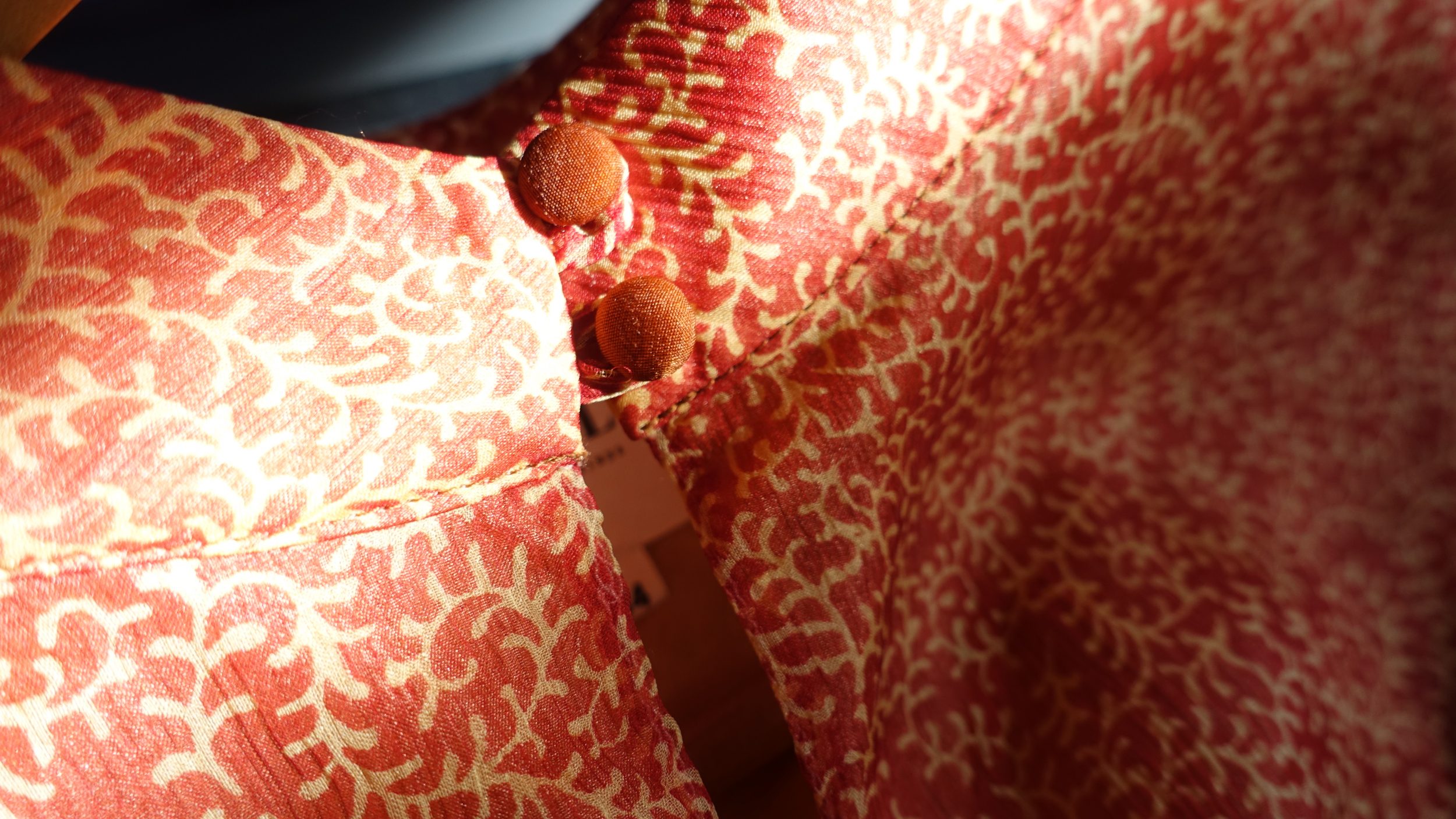 Outros detalhes incluem também o cinto de seda pura, os botões cobertos com seda (mesmo tecido do cinto). Até as mangas estão completamente forradas.