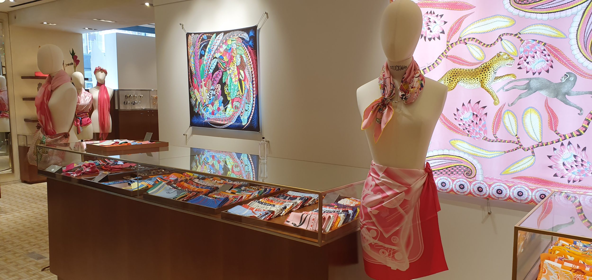 Para nos ajudar nas nossas escolhas, os quadrados da nova colecção são destacados como objectos decorativos. Isso permite que você veja os detalhes e se inspire. O modelo que eu tinha visto “Feathers in celebration”, também estava disponível e em destaque. Ao seu lado, há bustos de manequins, nos quais as vendedoras nos mostram como dar nós a uma praça Hermès…