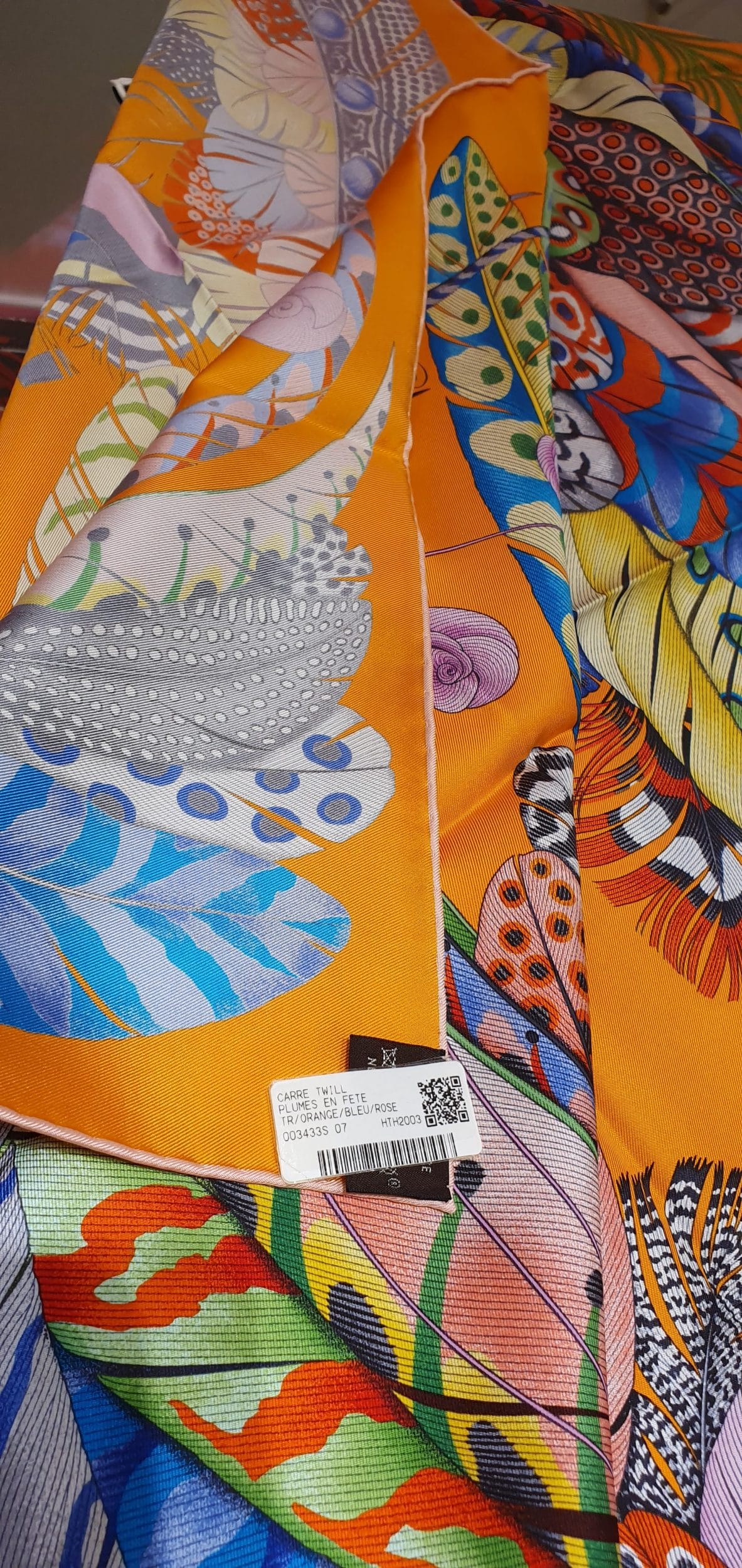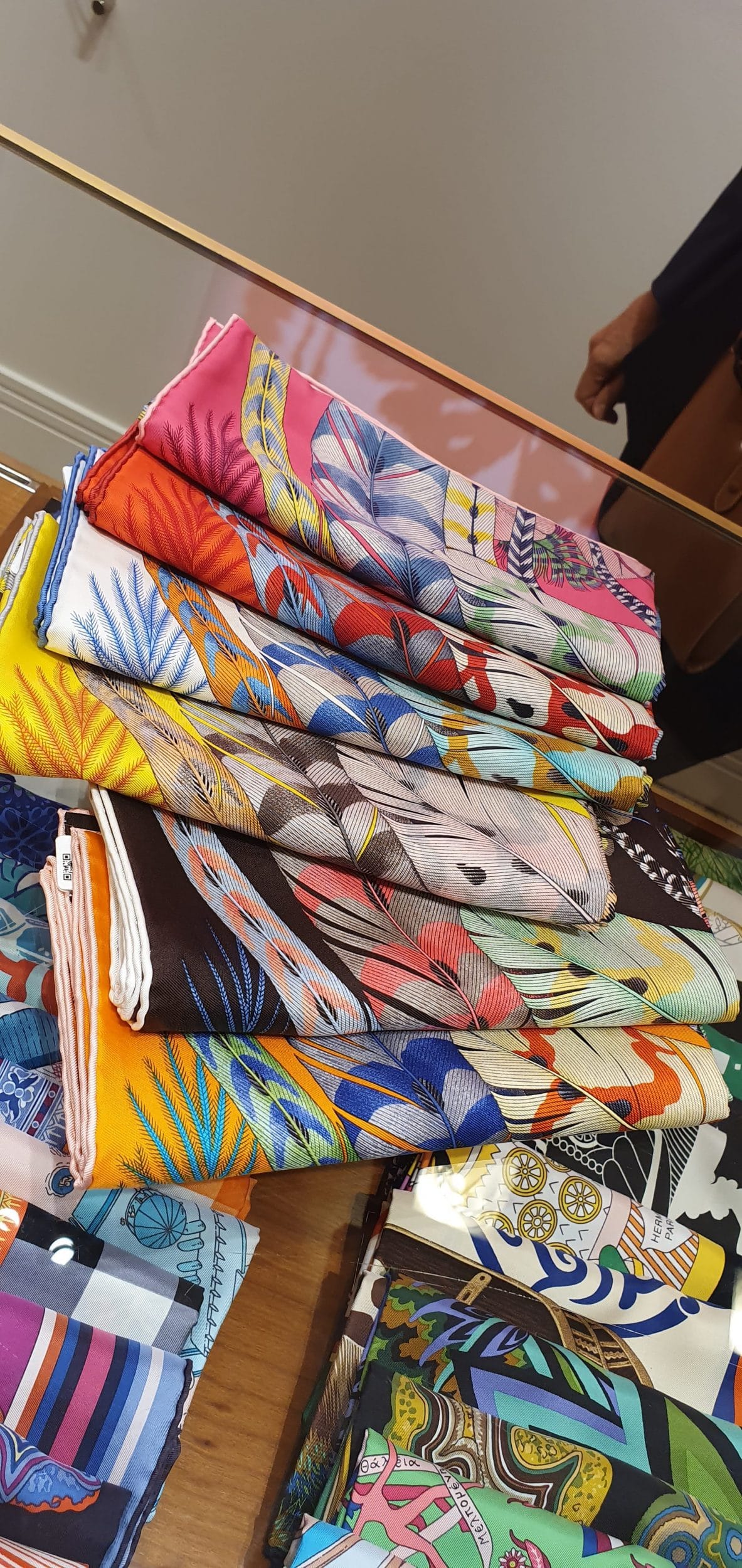 Depois escolhi dois lenços para comprar. A vendedora anota o meu nome e oferece-se para criar uma conta de cliente para mim. Ela me diz que eu posso dar a volta na loja e se eu quiser comprar algo mais, só tenho que dizer aos outros vendedores que já tenho um formulário de encomenda em preparação. Volto 10 minutos depois, ela me acompanha até a caixa com o meu pedido já embalado e pronto para ir. O pagamento é feito muito rapidamente, recebo minhas duas caixas de lenços Hermès, com o catálogo 2020 dos quadrados Hermès, a fatura e um cartão perfumado.