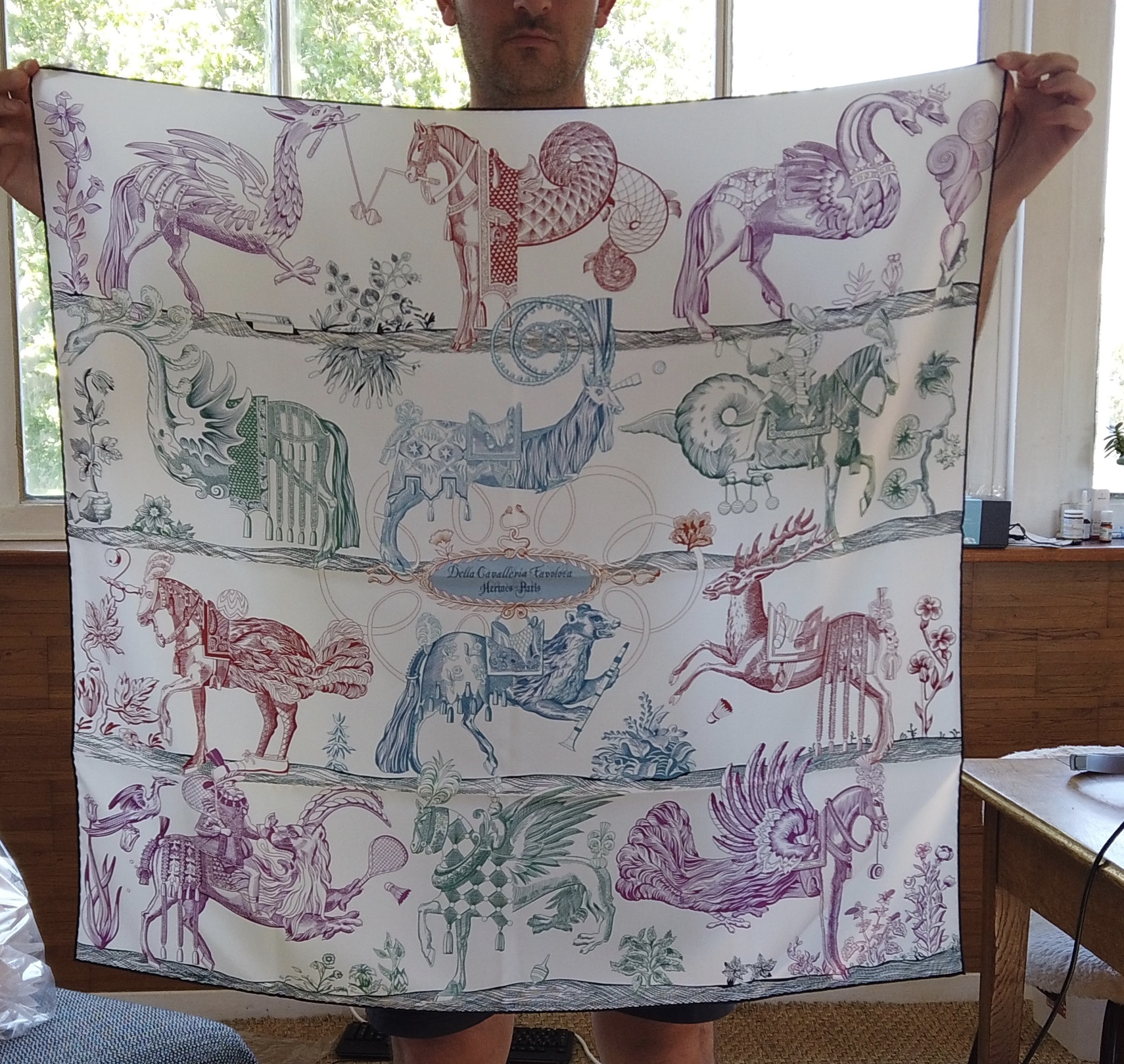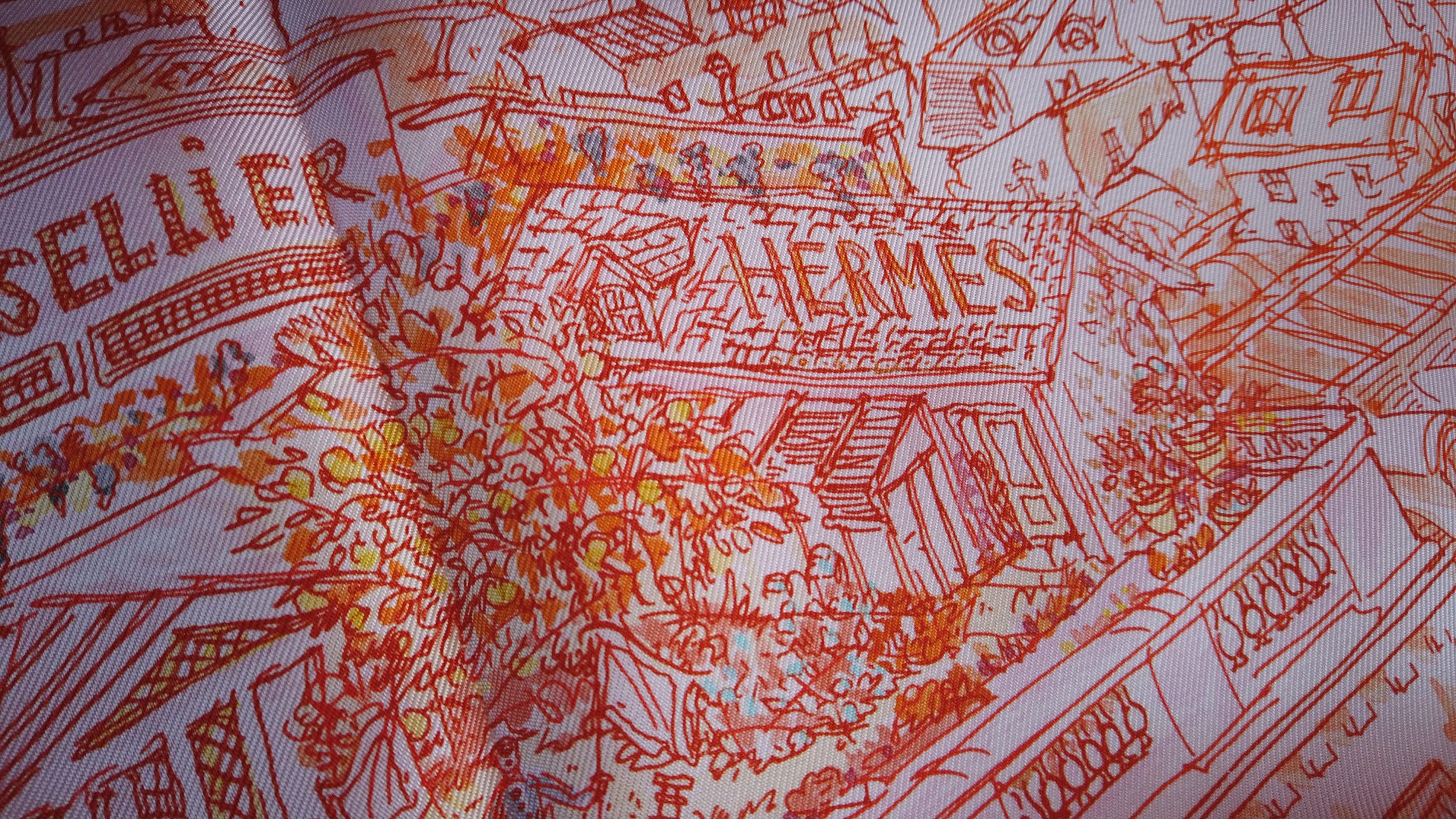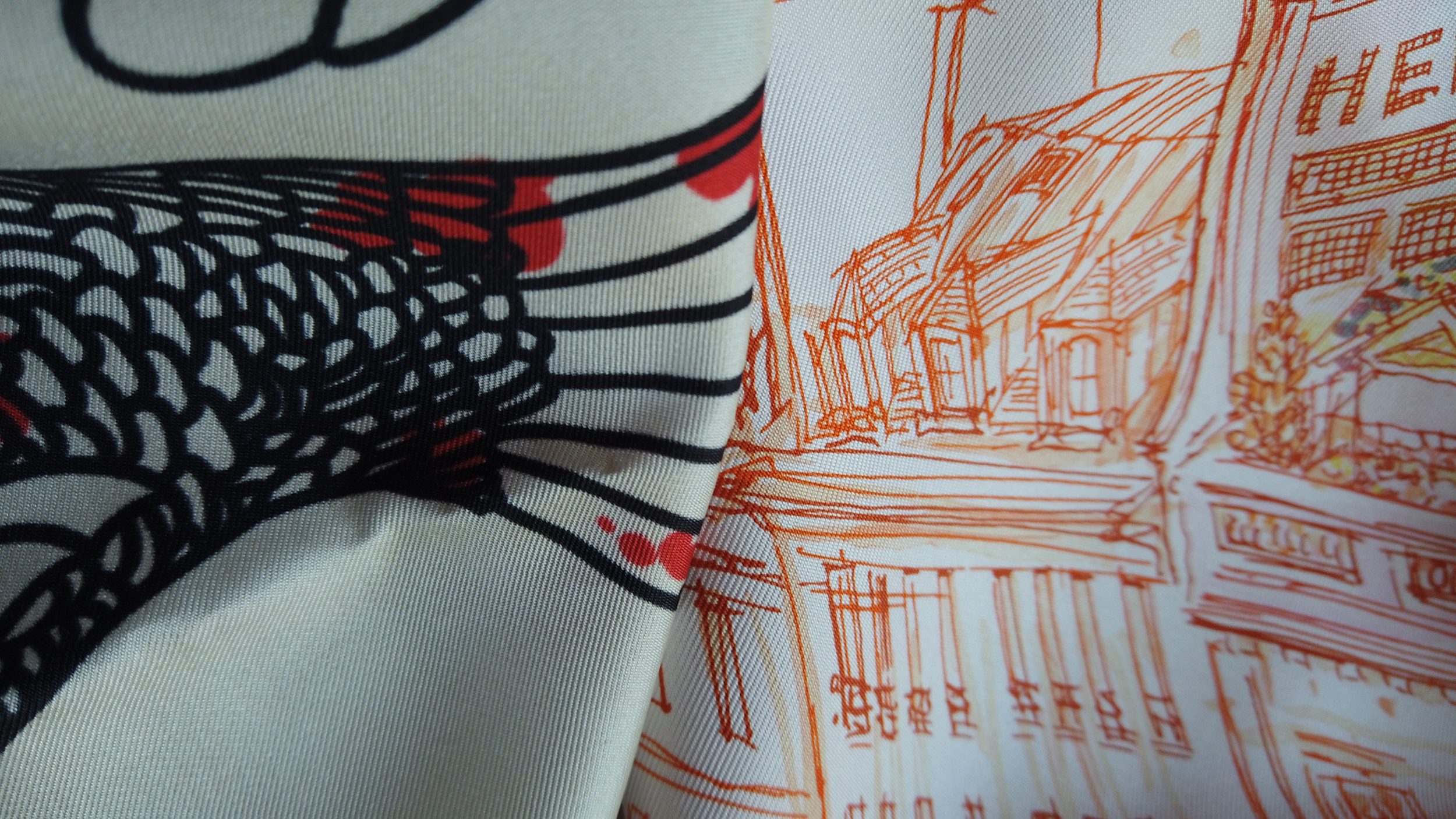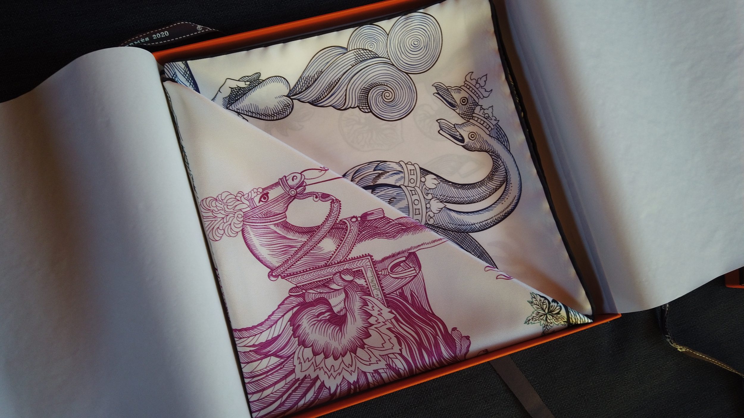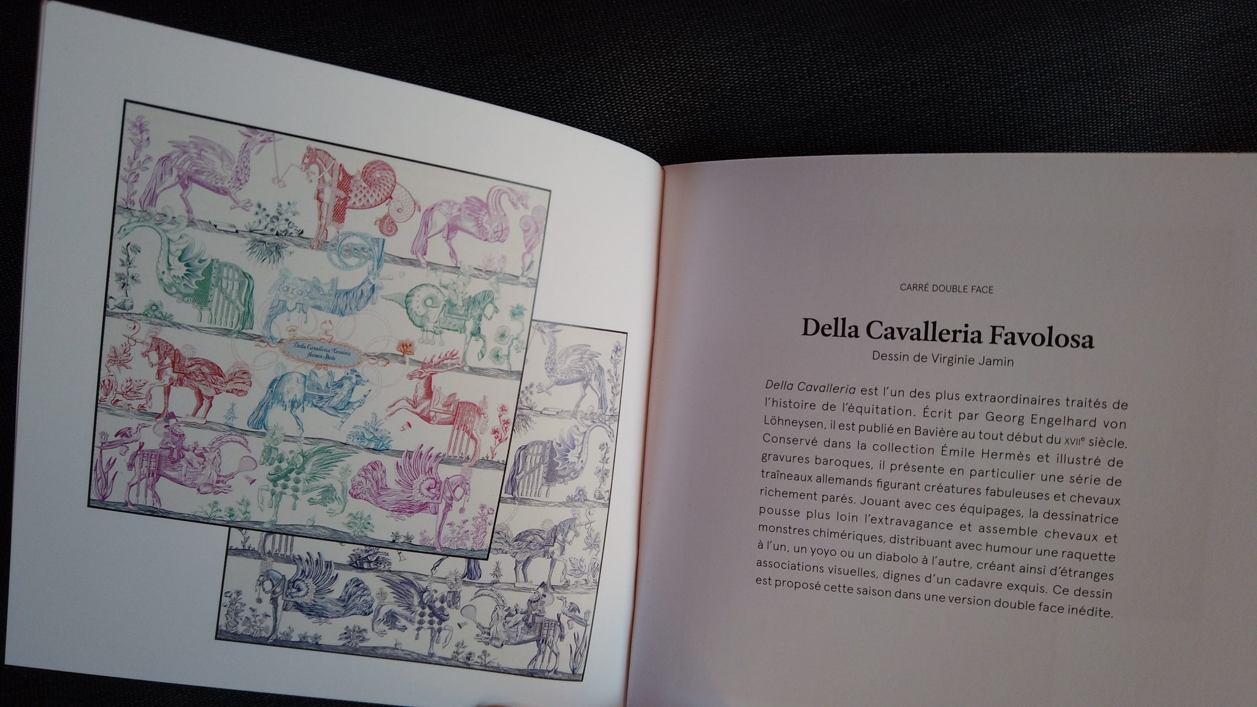 O relatório não só foi emocionante, como também revelou que Hermès tinha, pela primeira vez, produzido quadrados de dupla face usando uma técnica de impressão inovadora. Eles são, de momento, os únicos que sabem como fazê-los. Três modelos de mulheres + um modelo de homens estão em oferta, incluindo um do Cocas Oliver.