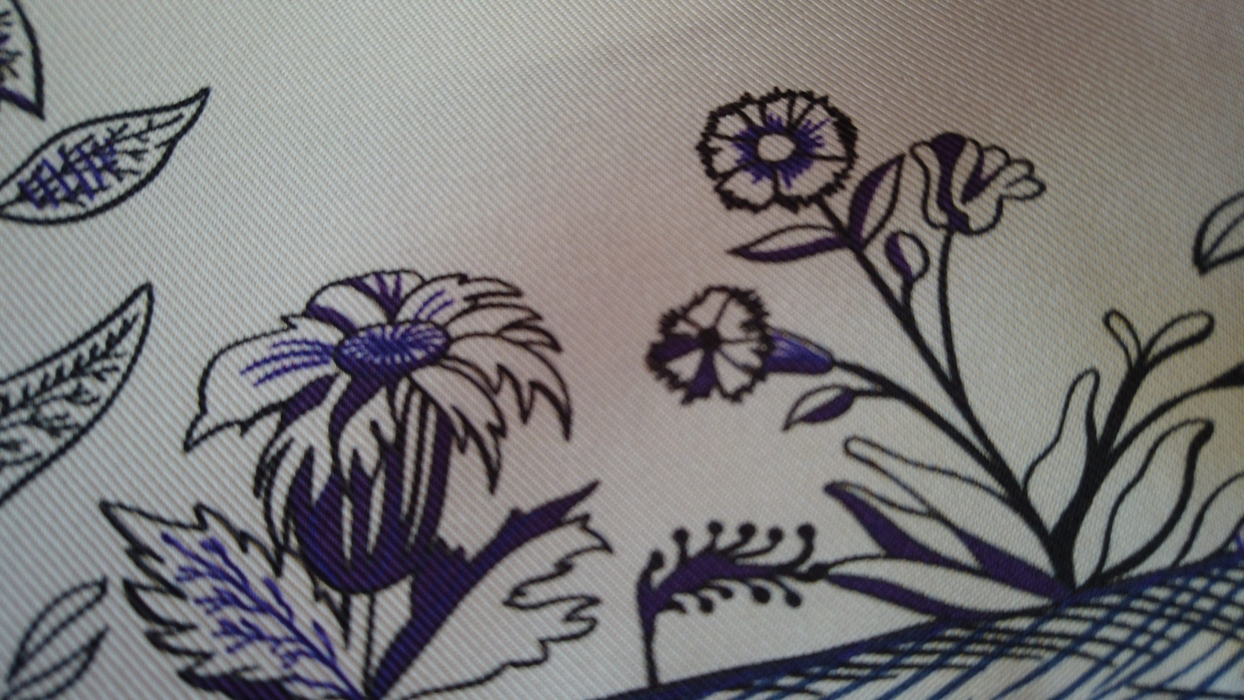Como comparação, à esquerda pode ver-se uma nova praça, tecida e feita na França (em Lyon, como Hermès), também em sarja de seda mas que custa 4 vezes menos que Hermès. Você pode ver que as cores “babam”, a seda é menos espessa, enquanto que na Hermès (à direita), a seda é muito mais brilhante, mais espessa e as cores são claras e precisas, elas não babam em nada.