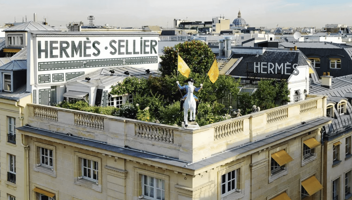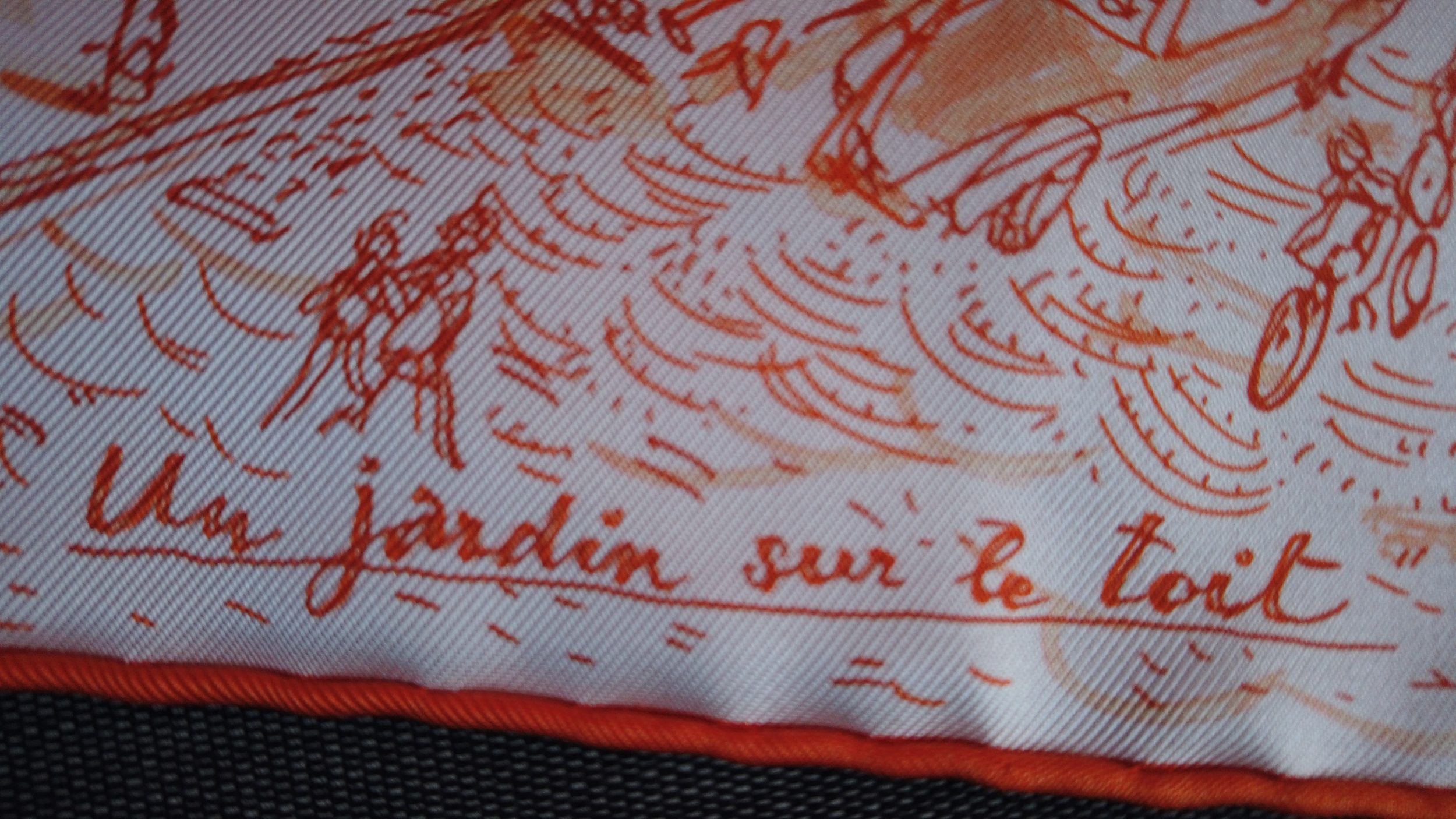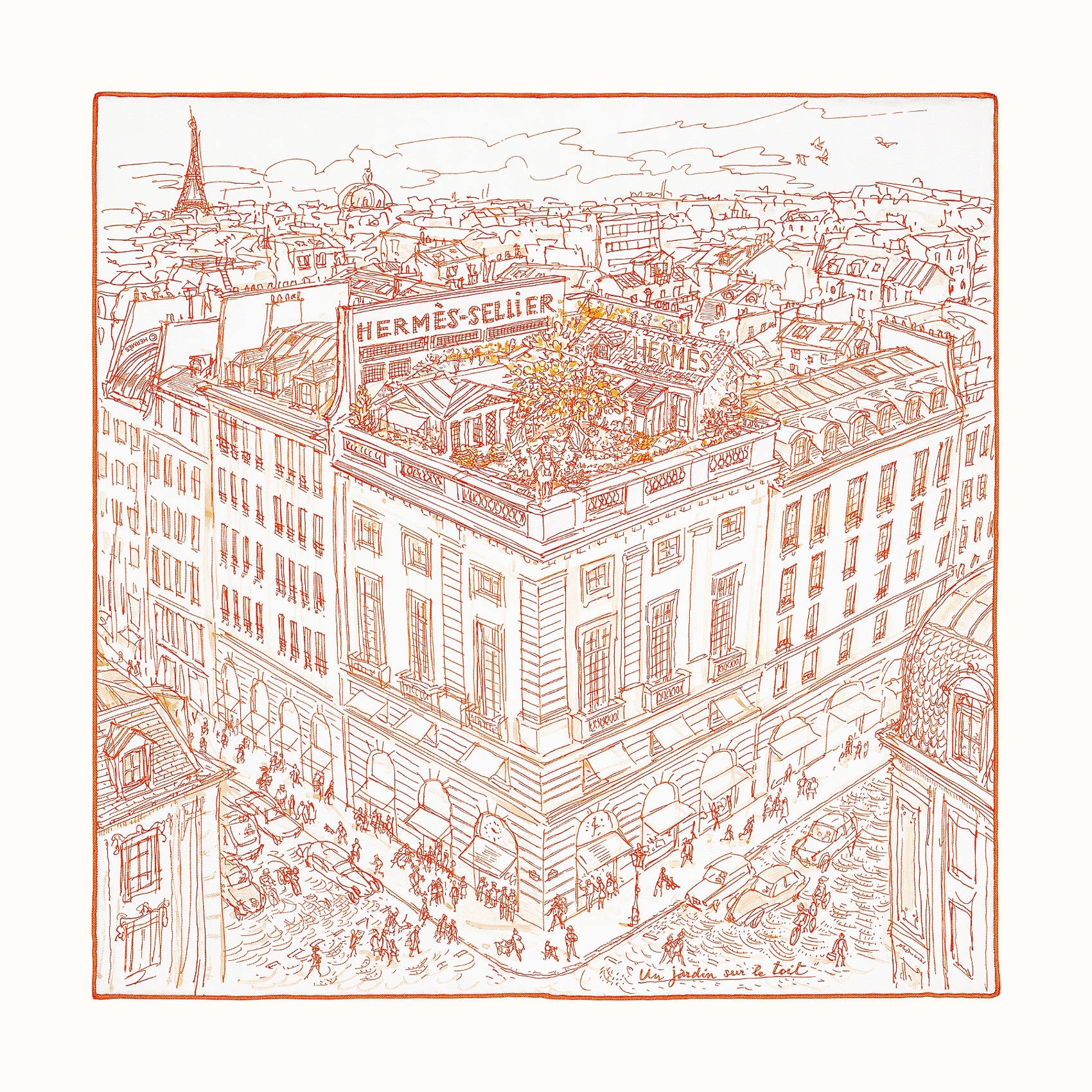 Um Rooftop Garden é antes de tudo este terraço verde e arborizado no 24 Faubourg Saint-Honoré. Existe desde meados da década de 1920, quando Émile Hermès se comprometeu a levantar o edifício, aumentar a superfície da loja e das oficinas de couro e montar um armário de curiosidade para a sua colecção. Este jardim suspenso, chamado o “recipiente” da casa, faz parte da sua história. Modelos de costura foram lá fotografadas a partir dos anos 30, batatas foram cultivadas para alimentar o pessoal durante a Segunda Guerra Mundial, Robert Dumas plantou lá uma macieira, e seu filho Jean-Louis decidiu transformar essas maçãs em geléia. Em 1987, para o 150º aniversário da casa, foi lá instalado um cavaleiro artificial! Reseda, impaciência, crocodilos, espinheiro, sálvia, rosas, tulipas, maçãs… ao longo dos anos, tornaram-se um verdadeiro “jardim de prazer que faz o que agrada e nos canta a amar a vida”, diz o perfumista Jean-Claude Ellena quando, em 2011, esta vegetação urbana luxuriante o inspira a criar uma eau de toilette. Philippe Dumas, que conhece este jardim desde a sua infância, criou um dos seus desenhos secretos para a ocasião, numa linha animada e encantadora.