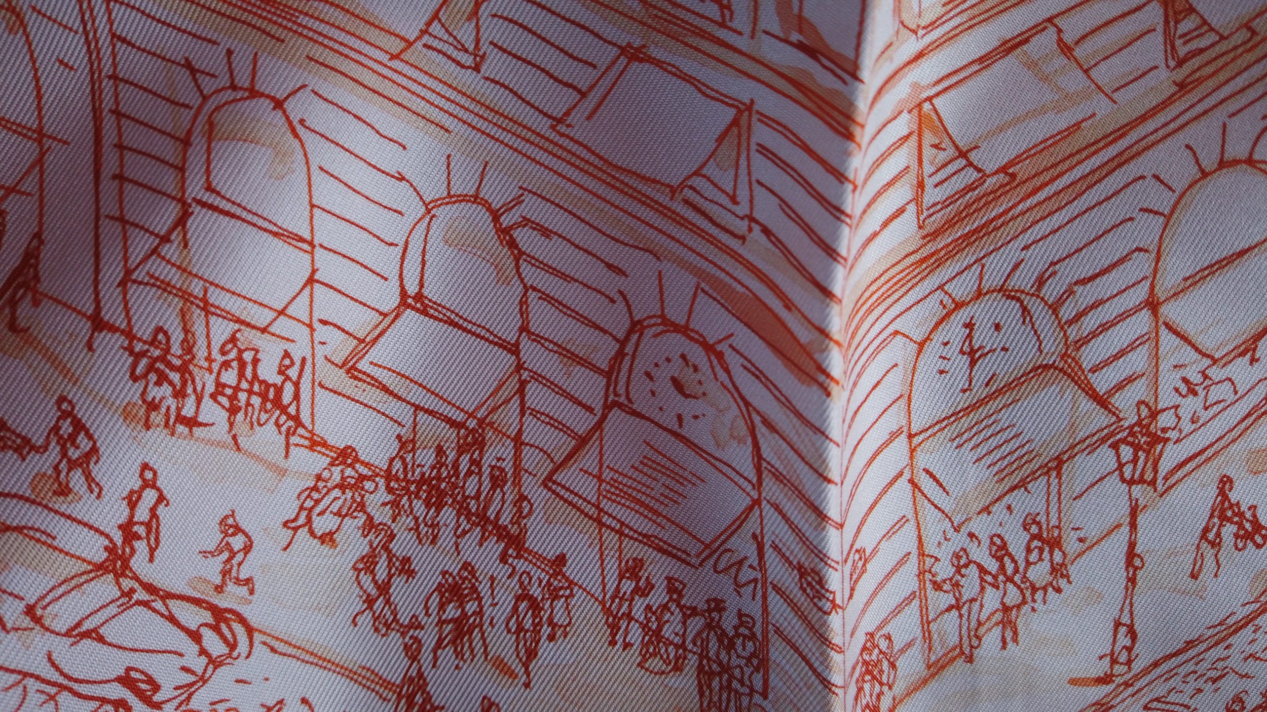 Há um verdadeiro know-how por detrás destas praças. Primeiro você tem que criar o design, depois isolar as cores. Ou seja, criar uma chapa de impressão (uma espécie de stencil especial) para cada cor. Se o design for complexo, você pode ter cerca de quarenta “stencils”. Depois, as bordas são enroladas à mão, e leva 45 minutos para um artesão Hermès enrolar um quadrado. A mesma técnica de impressão é utilizada pelo Atelier de Soierie de Lyon, que vende as suas praças por 150 euros, assim, com a luxuosa imagem de Hermès + os artistas convidados a criar as praças, você pode obter 375 euros em Hermès.