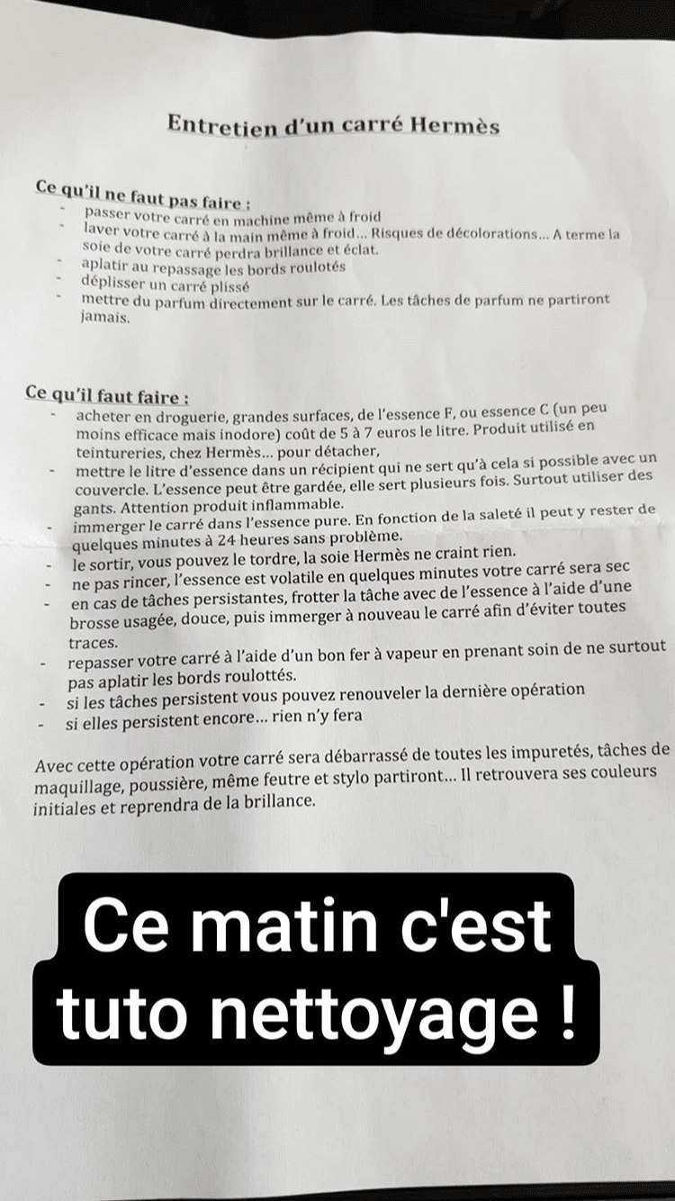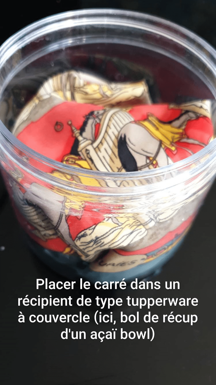 Mesmo na lavandaria francesa, eles não conhecem necessariamente o princípio das bordas enroladas que não devem ser achatadas com um ferro. Para saber se uma lavandaria sabe como fazê-lo ou não, vou fazer perguntas como “olá, tens o hábito de limpar os quadrados Hermès?” “Então sabes de arestas?” e deixo-os dizerem-me o que sabem sobre arestas ahaha. Se eles apenas dizem “sim” sem dar detalhes, eu não confio neles. Em Rouen, encontrei uma lavandaria que cuida muito bem dela: a Euro Pressing, place saint-marc