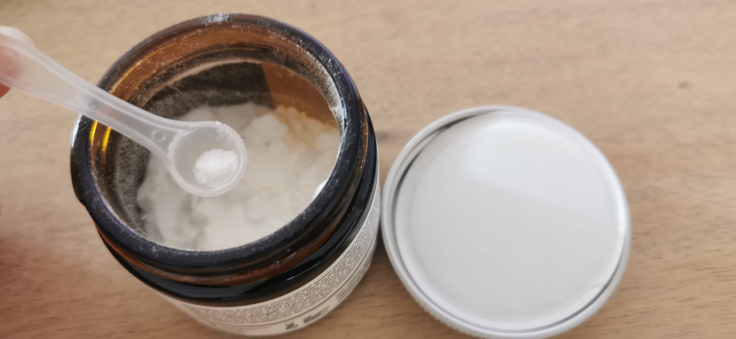 Uma colher de plástico é fornecida. Podes ver que o pó está cheio a meio caminho do frasco. Mas eles ainda querem nos fornecer um grande pote, provavelmente para que possamos guardar a colher nele…?