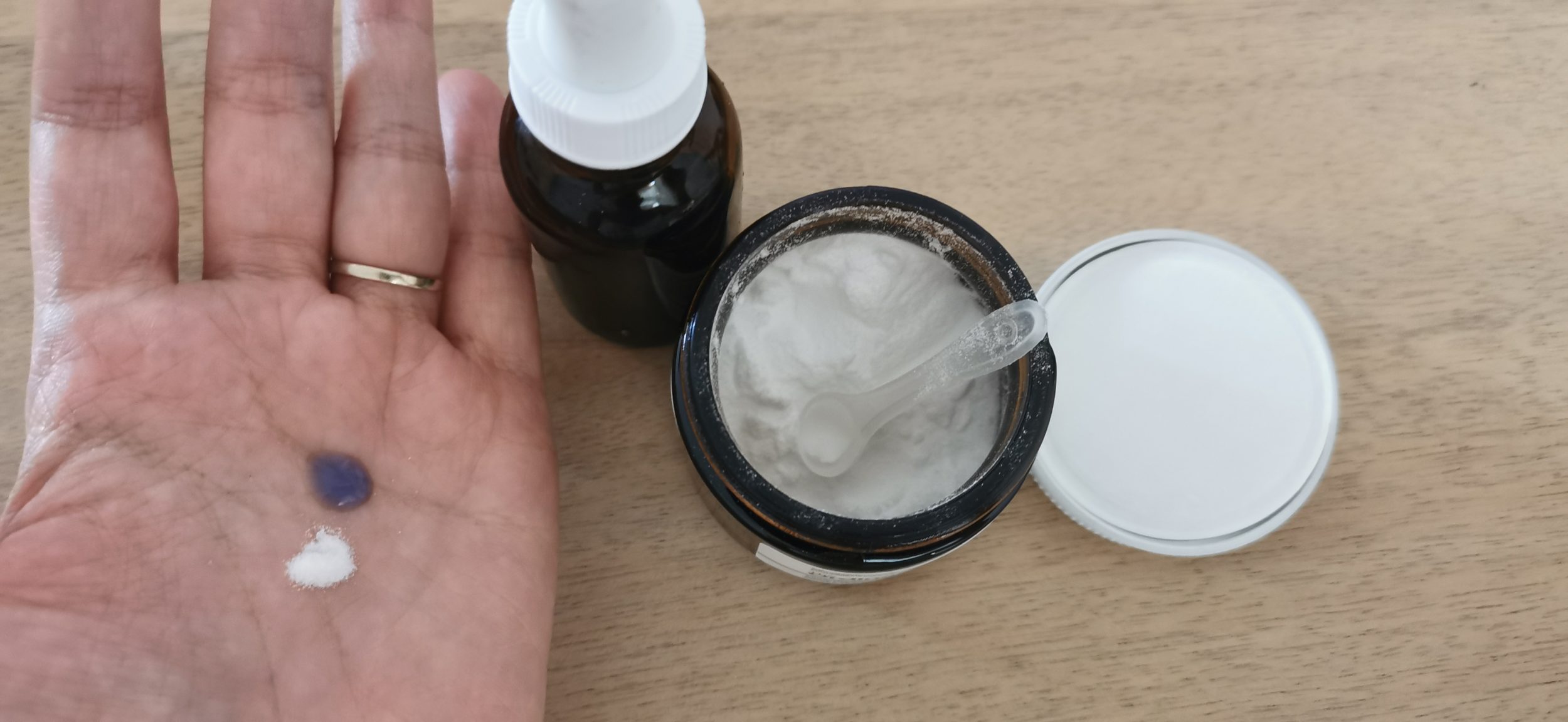 Aqui mostro-lhe 1/4 colher de pó de niacinamida com 1 gota de Buffet + Peptídeos de Cobre a 1%. O pó é super fino, por isso não o mistures num lugar ventoso.