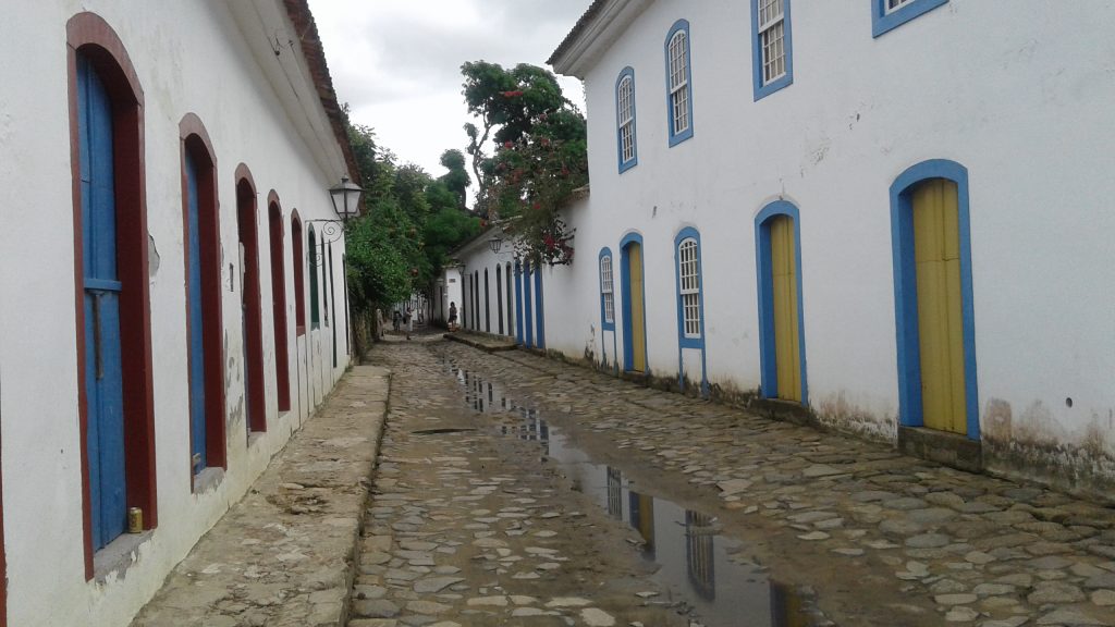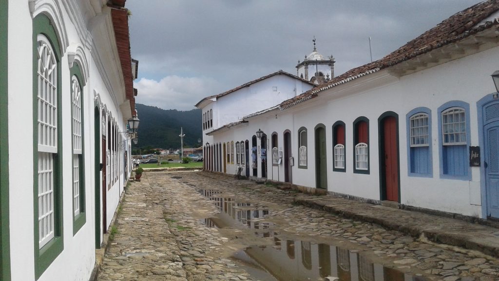 Hoje, enquanto chove, as ruas de Paraty estão inundadas. Aparentemente, isto é feito de propósito: os fundadores da pequena cidade colonial desenharam a cidade desta forma para permitir que a chuva limpasse os paralelepípedos onde os esgotos costumavam escorrer