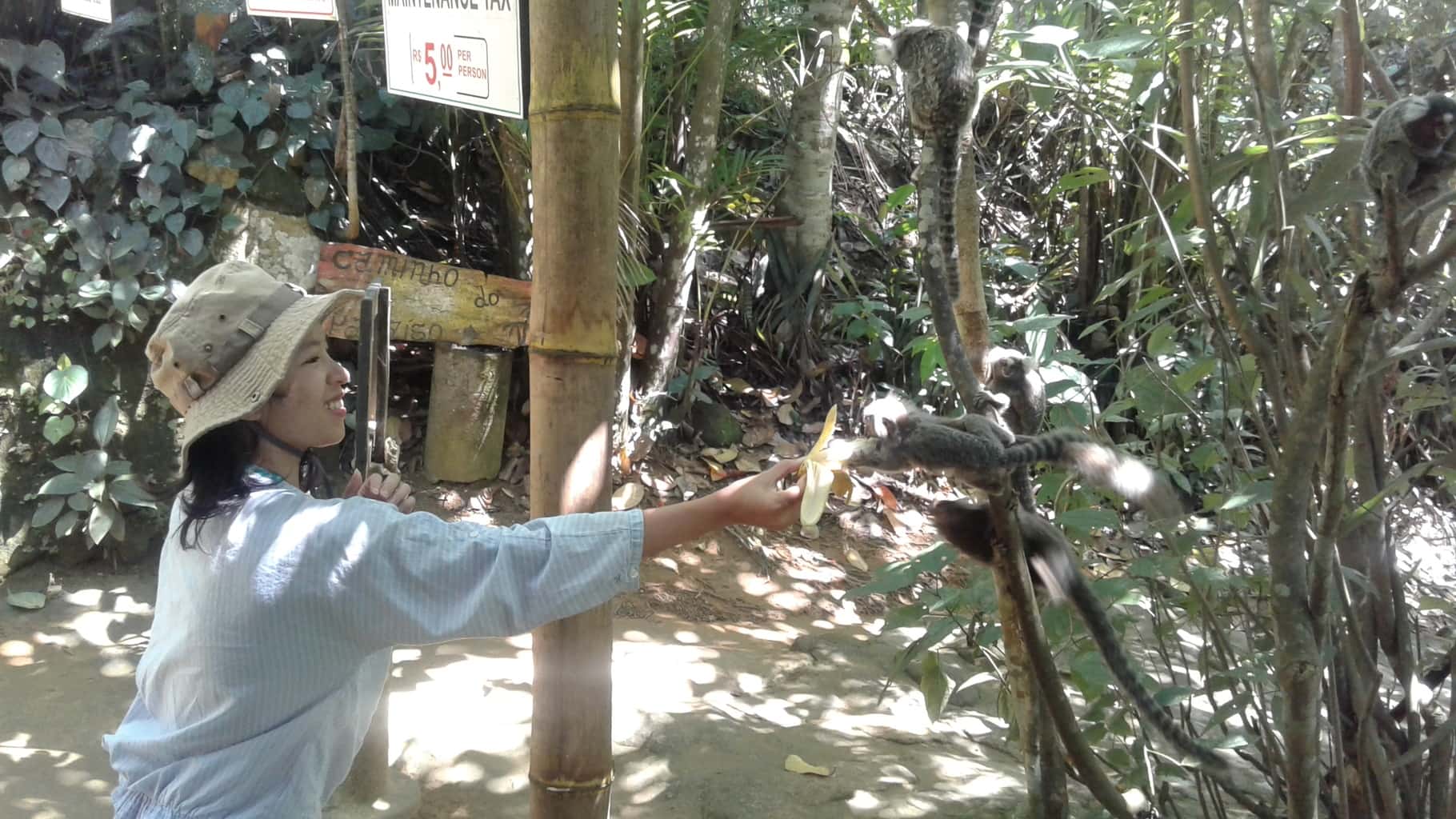 O guia dá-me uma banana para alimentar os mini-macacos. São tão pequenos como os gatinhos e agarram-se às bananas para comer.