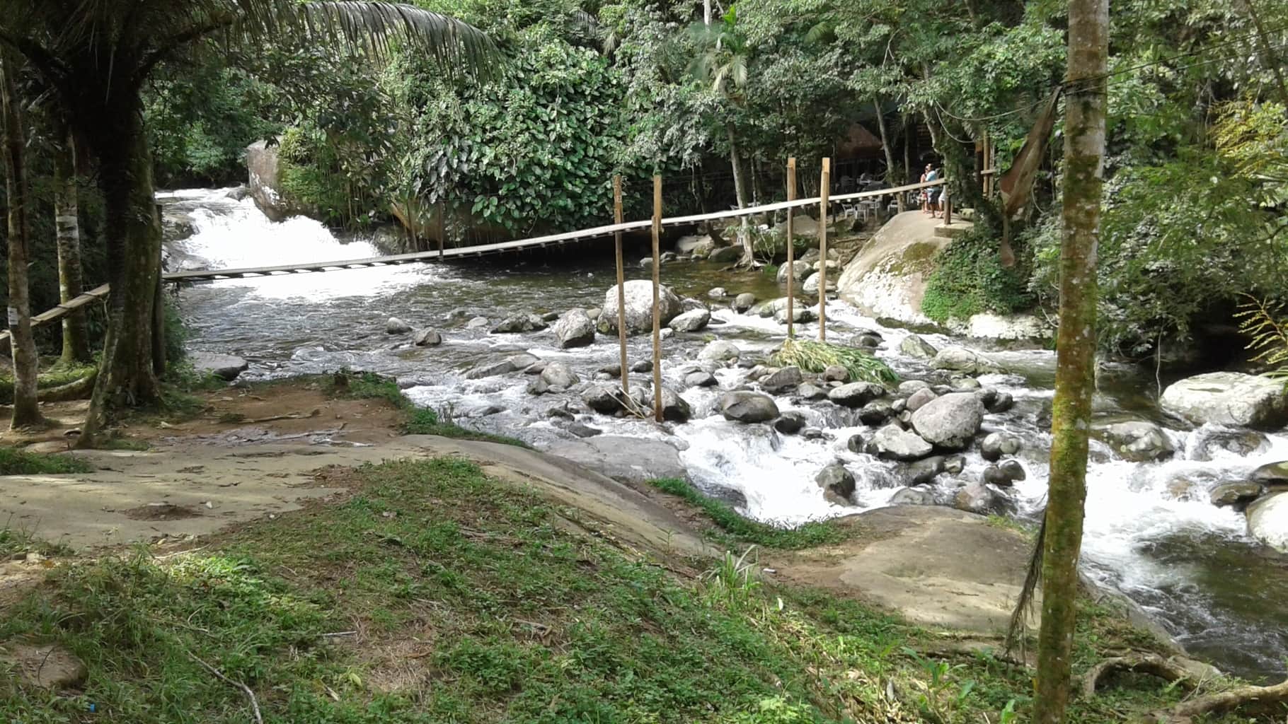 Estamos a almoçar junto a um rio. O restaurante é acessível através de uma ponte suspensa. Capacidade máxima: 2 pessoas