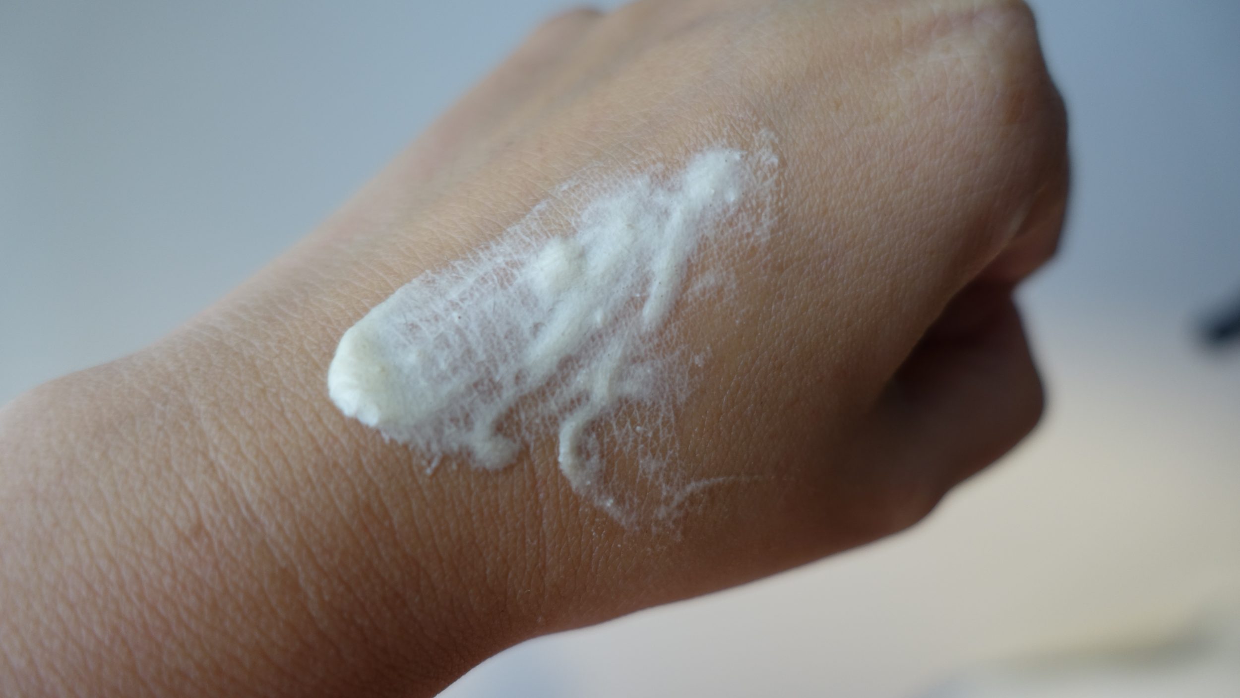 O aminoácido está em suspensão, daí as pequenas sementes doces no “iogurte”, que derretem quando espalhadas sobre a pele. Uma vez aplicada na cara, a coisa toda não cheira nada mal.