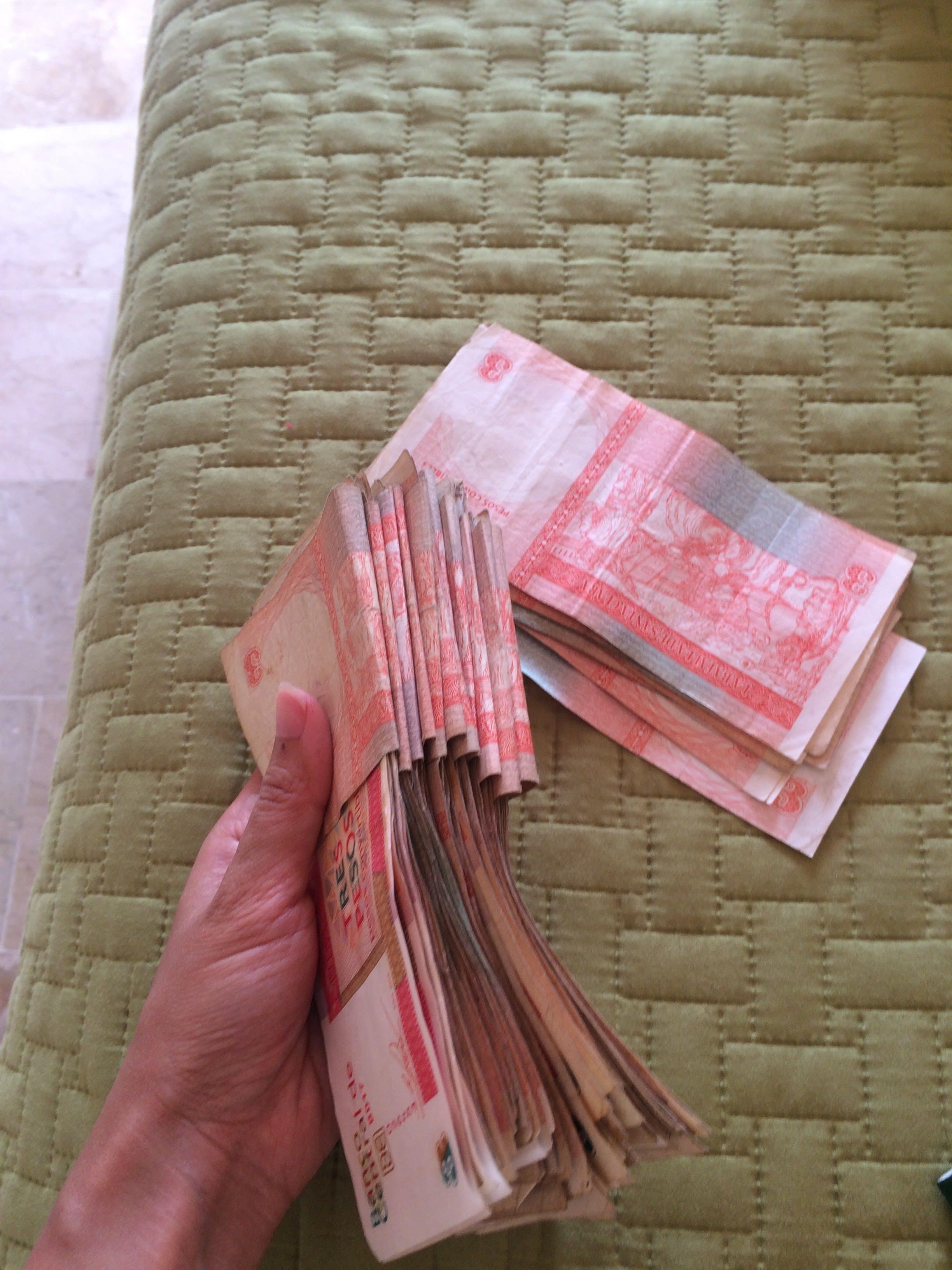 Eu troco 400 euros no CADECA. A funcionária me disse que ela só tem notas de 3 pesos, então ela me deu 135 notas de 3CUC. Eu me sinto como um milionário 😀 Outro turista me vê com minha pilha de dinheiro e me diz que é melhor do que estar com apenas 20 pesos (você pode sentir a experiência). Aqui, mesmo para uma conta de 5CUC, as pessoas não têm (ou fingem não ter) nenhuma mudança.