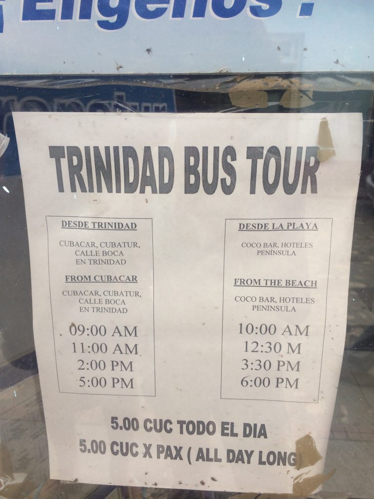 • O ônibus de Trinidad Bus Tour / ônibus turístico que vai de Trinidad -> Playa Ancon parte de Havana Tour. Digite “Ônibus para Praia” no Maps Me para encontrar a localização exata. Este autocarro sai de Trinidad às 9h, 11h, 14h e 17h. Deixa Playa Ancon às 10h, 12h30, 15h30 e 18h. 5CUC/pessoa/dia. O bilhete é comprado directamente no autocarro.