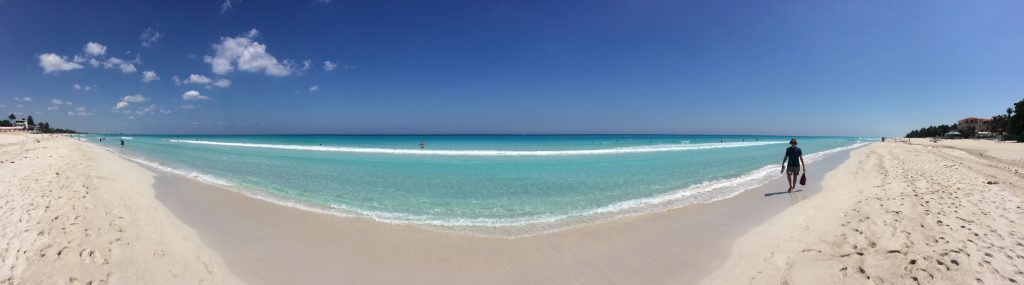 A praia de Varadero é realmente extraordinária. Além dos seus 20Km de areia branca, a água é tão transparente que você pode ver seus pés debaixo d’água. Não há desperdício na água (algumas folhas de coco aqui e ali, mas não é nada). Os primeiros 5 metros são muito divertidos, você pode saltar as ondas, a água chega às suas pernas. Se queremos ficar quietos, só temos que nos afastar um pouco, a água chega ao tronco, não há mais ondas. A água é particularmente salgada, você pode fazer a estrela e flutuar na água sem qualquer esforço (parece o Mar Morto). É a cor da água que me impressiona particularmente, esta água turquesa, acho que nunca vi assim em nenhum outro lugar. É o tipo de praias que eu gosto: você pode ser ativo se quiser ou apenas ficar bronzeado olhando para estes belos tons de azul. E se nós realmente queremos mergulhar, um cara se oferece para nos levar por catamarã a 50m da praia, ele alimenta os peixes enquanto nós mergulhamos por 20CUC/pessoa/1h.