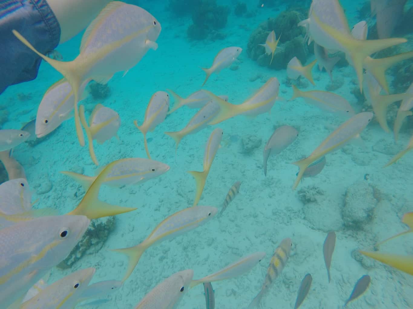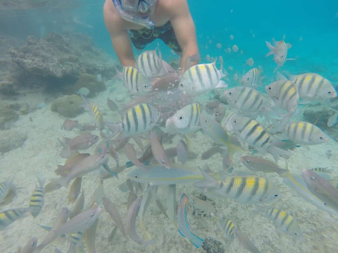 Aqui novamente, um turista alimenta o peixe com pão, e você está cercado por uma centena de peixes de todas as cores. Eles calculam bem os seus movimentos porque nenhum deles nos tocou. Acho que é uma pena alimentar os peixes desta maneira, não é o seu alimento natural. Além disso, torna o snorkelling muito fácil e reduz a maravilha da descoberta