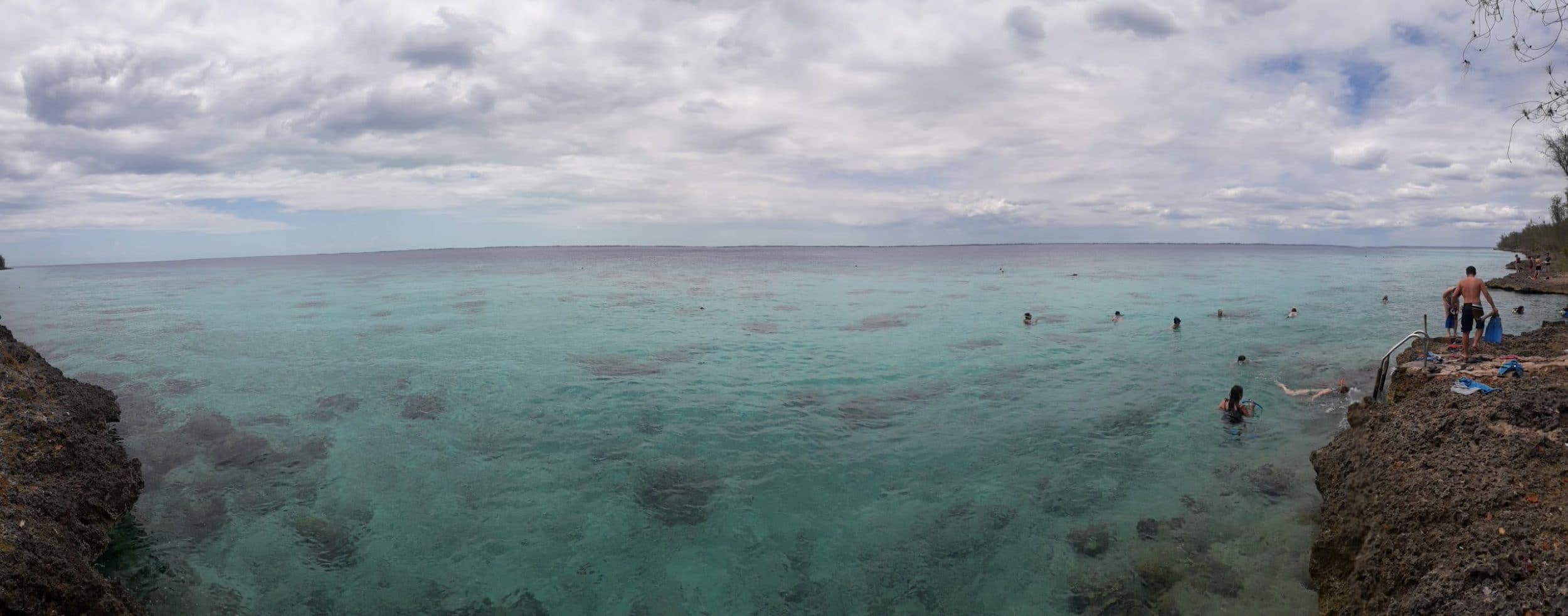 Instalamo-nos num restaurante com vista para a praia, debaixo dos coqueiros. A paisagem é magnífica, a praia é incrível! Água transparente a 180°! Há muito pouco vento, a água chega até às coxas, os corais estão presentes mas não são invasivos. Perguntamo-nos o que fizemos para merecer tantas coisas boas
