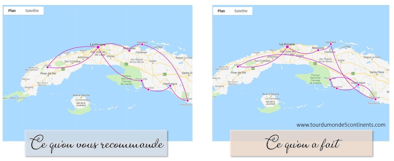 Aqui está o nosso itinerário, mas se tivéssemos de o fazer novamente, tê-lo-íamos feito pela seguinte ordem (ver a foto à esquerda) Havana => Matanzas (de trem) => Varadero (táxi colectivo) => Trinidad (Viazul) => Cienfuegos (Viazul) => Playa Giron (Viazul) => Playa Larga (Viazul ou ônibus turístico) => Havana (Viazul) => Vinales (Viazul) => Havana (Viazul)